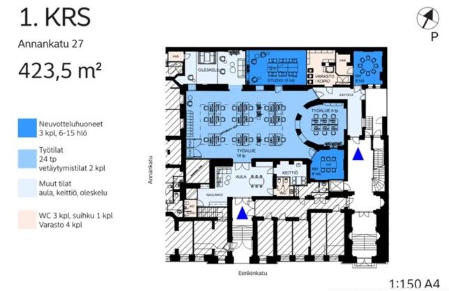Vuokrattavissa Helsingin keskustassa katutason 423,5 m2 liiketila. Liiketila avautuu talon atriumpihalle ja siinä on kattoikkunat tilan keskiosassa. Tilaan on oma sisäänkäynti Eerikinkadulta.