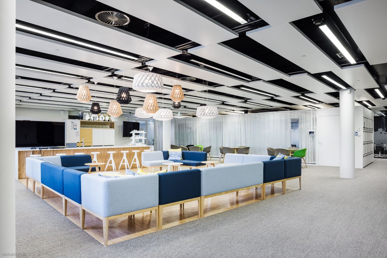 neuvotteluhuoneista, kolmesta auditoriosta, Fressin ylläpitämästä kuntosalista, kampaajasta, hierojasta ja fysioterapeutista. Ratkaisut ilmanlaadun parantamiseksi ja luonnonvalon määrän lisäämiseksi edistävät terveyttä ja hyvinvointia tiloissa.