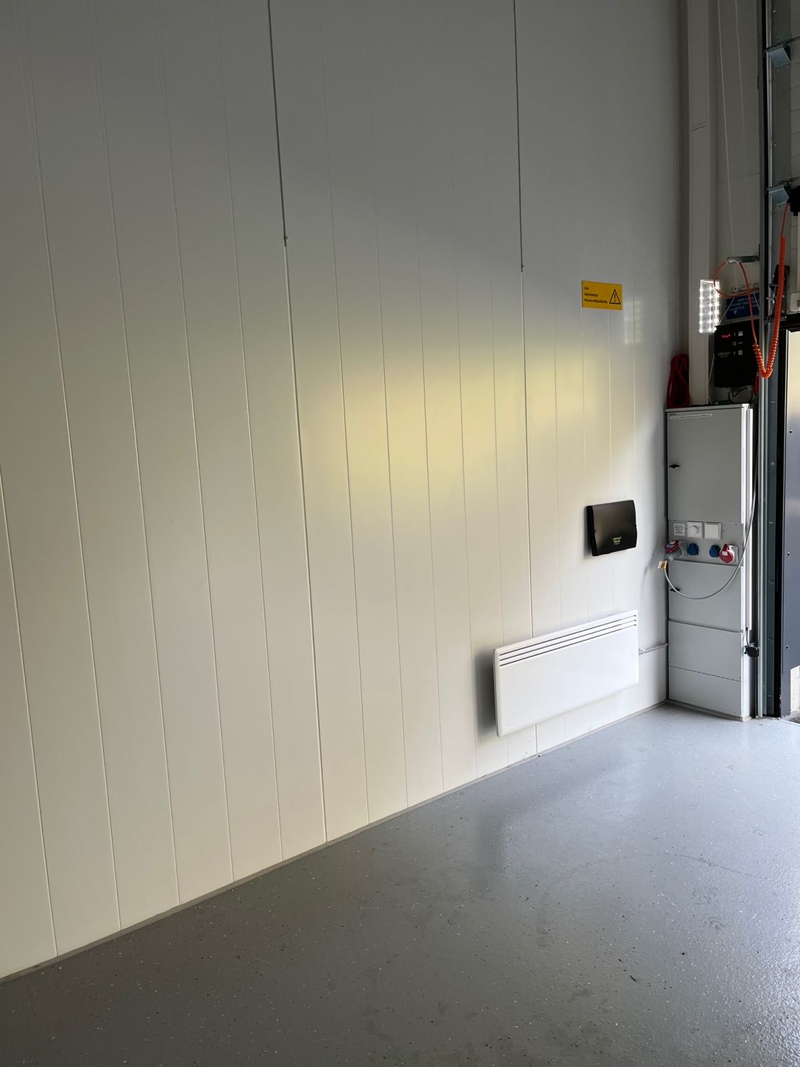 Moottoroitu nosto-ovi erillisellä käyntiovella. Autolla sisään ajettava tila. Tilamitat: 7,00 (Pituus) 4,50 (Leveys) 5,00 (Korkeus). Ovimitat: 3,45 (Leveys) 3,90 (Korkeus).