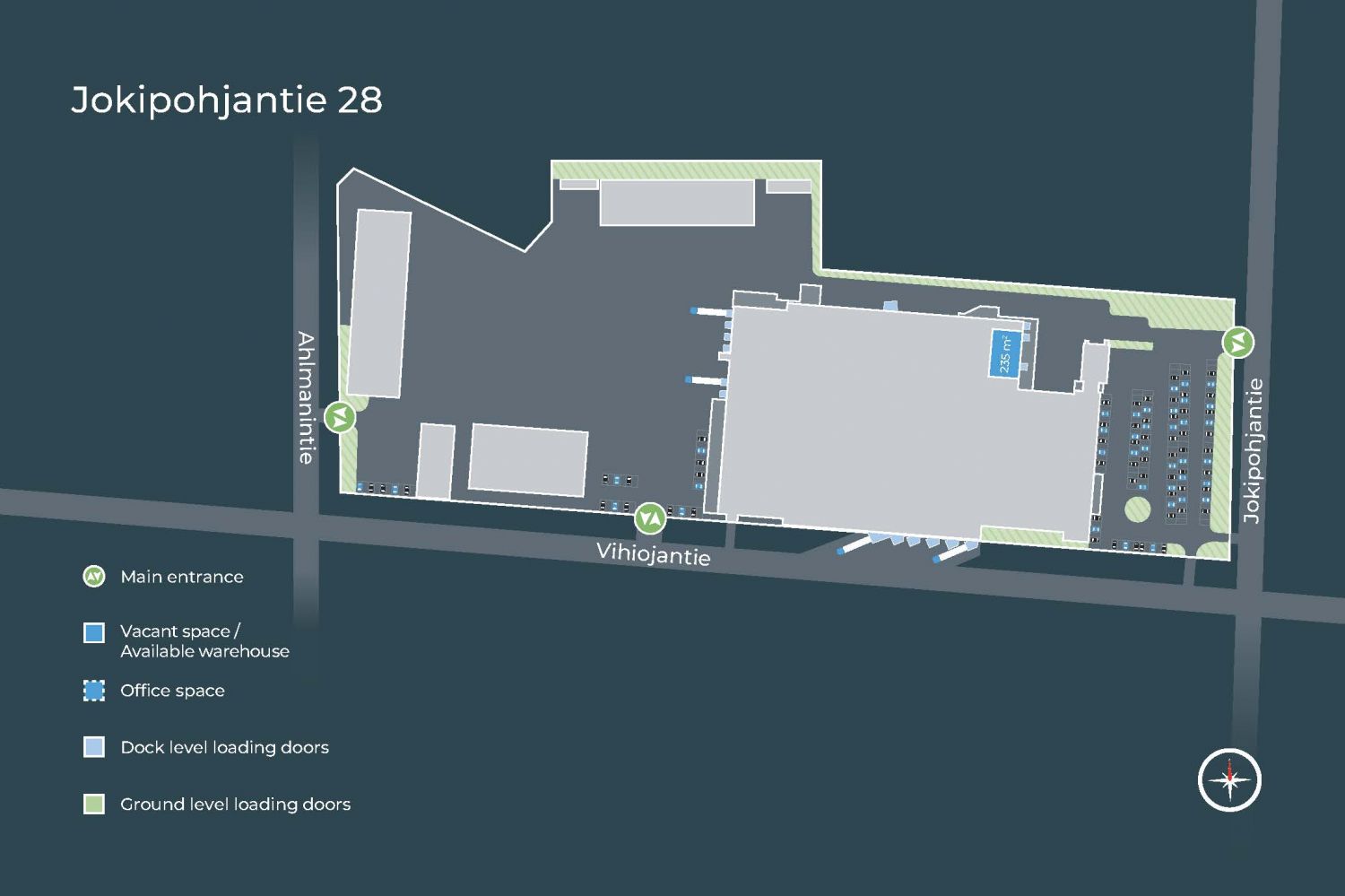 Vuokrattavana varastotilaa yhteisellä lastauslaiturilla. Tilassa ei ole omia sosiaalitiloja.