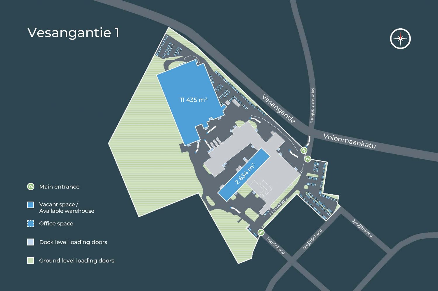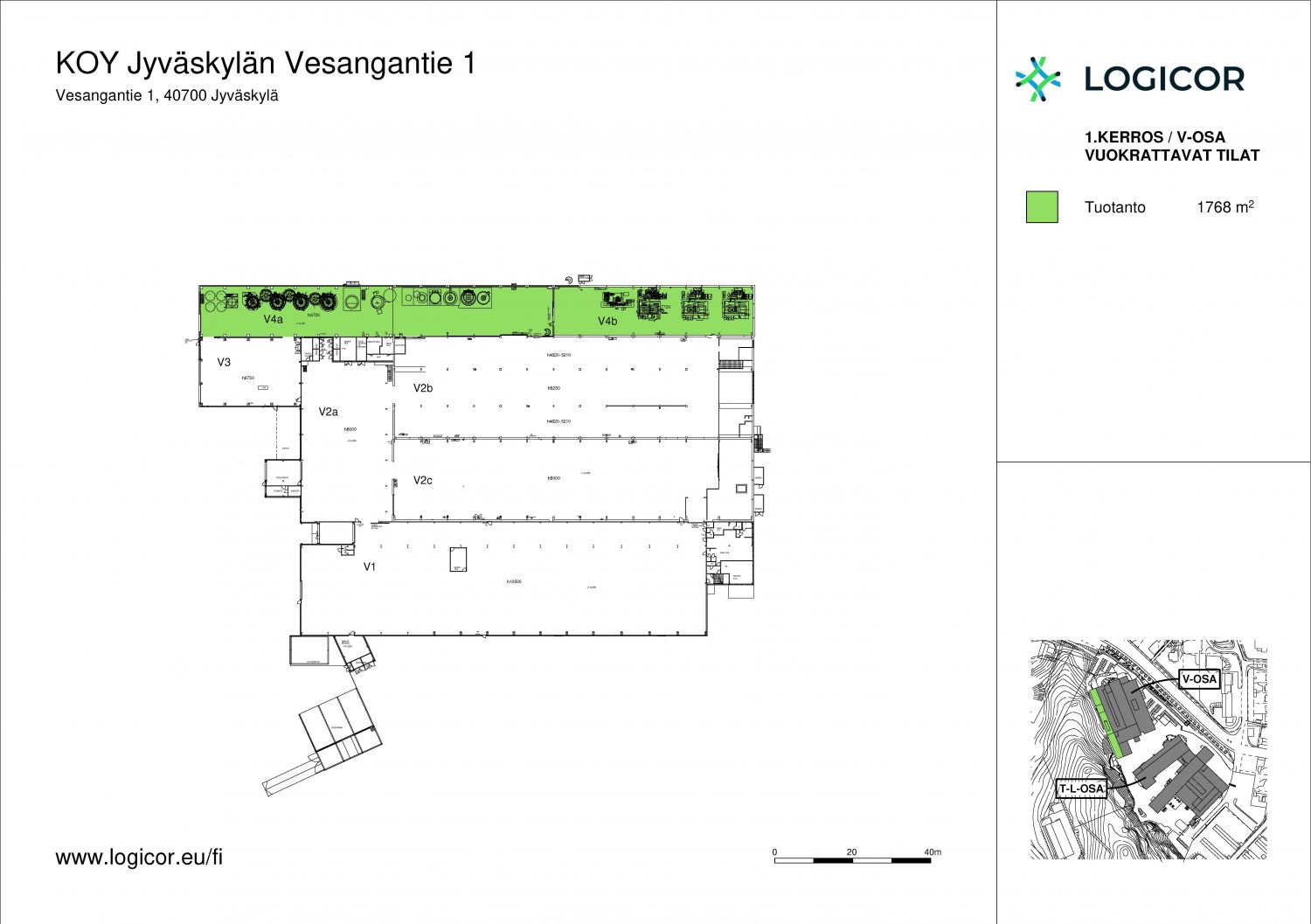 Tuotantotila (V4a ja V4b), joka soveltuu esimerkiksi kaluston huoltoon ja säilytykseen tai jopa pesulatoimintaan. Tilayhdistelmään on valmiina maatason nosto-ovi ja läpiajettavuus on mahdollista toteuttaa. Tilan maksimikorkeus on yli 9 metriä. Rakennuksesta on mahdollista vuokrata laajempi tilakokonaisuus toimisto- ja sosiaalitilojen kanssa.
