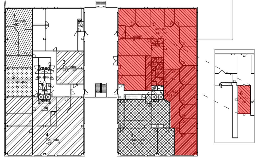 Toimistotila on pääosin avotilaa (pohjakuva ei pidä enää huonejaon puolesta paikkaansa).