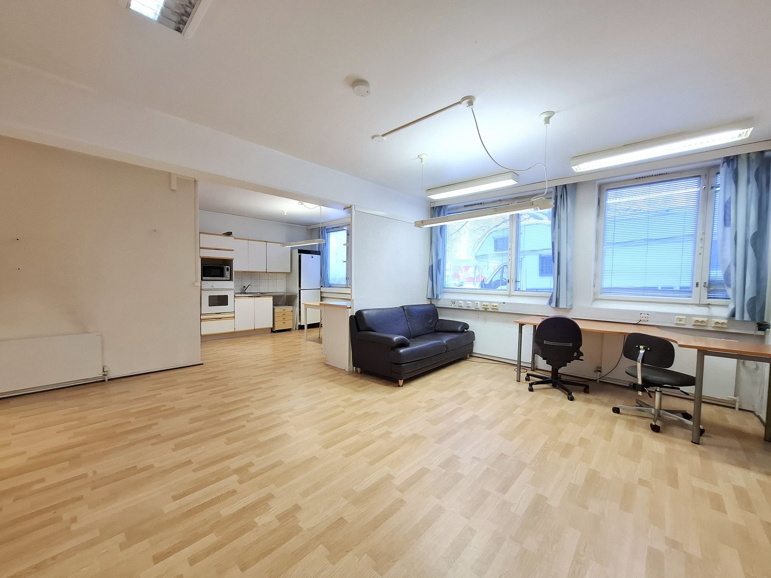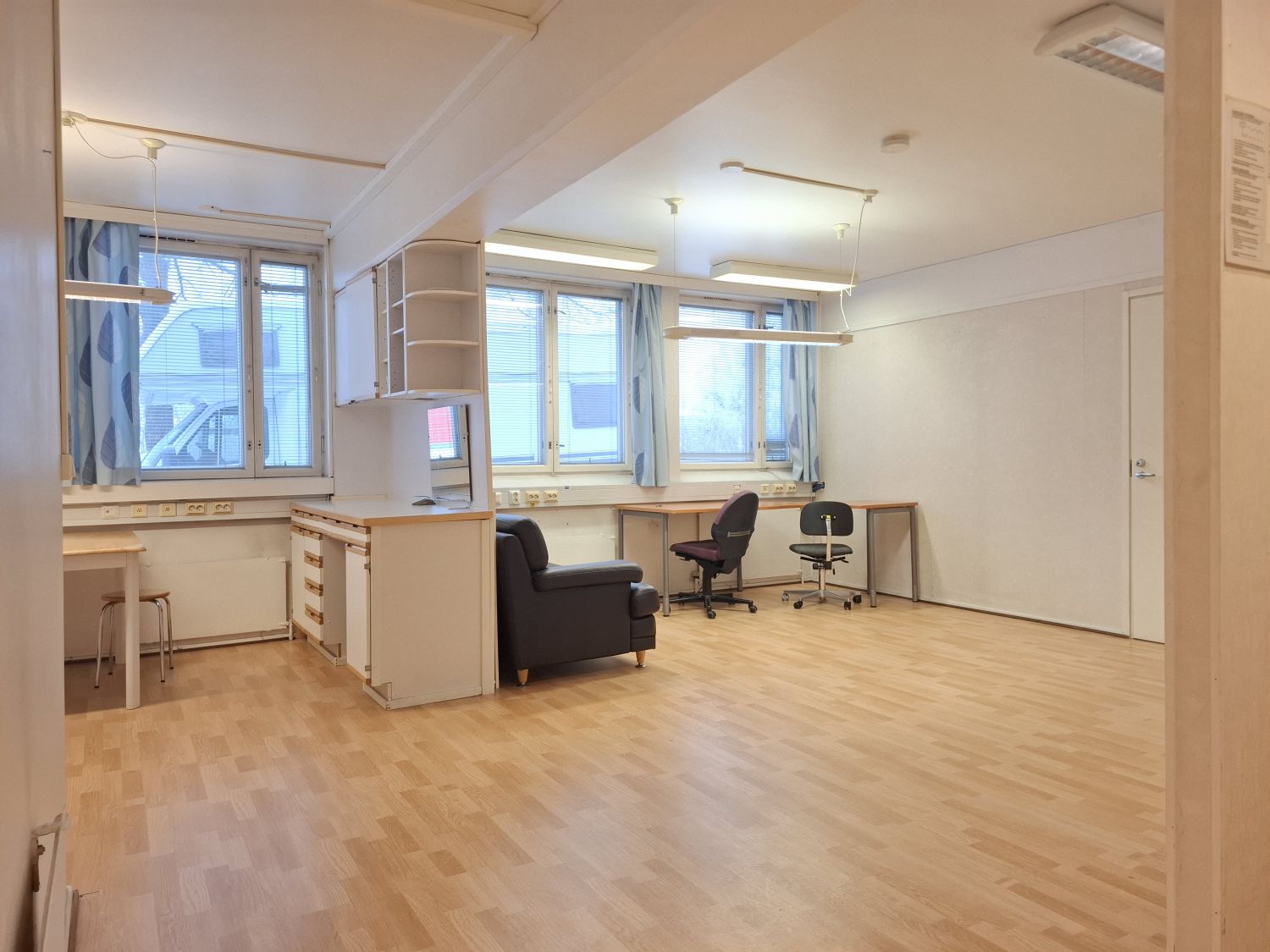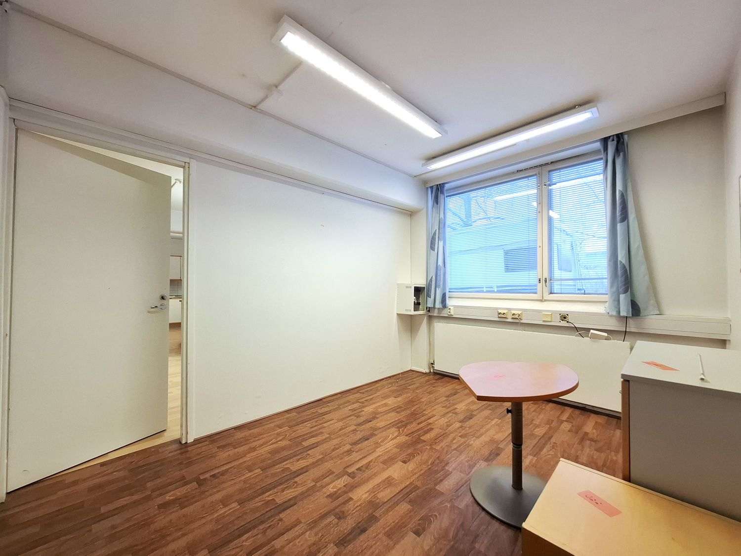 Tila sijaitsee talon päädyssä katutasossa ja koostuu isommasta avotilasta, kahdesta erillisestä toimistohuoneesta, wc:stä sekä avokeittiötilasta, jossa varustukseen kuuluu jääkaappi/pakastin ja liesi. Tila soveltuu erinomaisesti toimistokäyttöön tai esim. fysioterapeutin tarpeeseen. Tiloissa koneellinen ilmanvaihto ja hyvä valaistus. Tilaan mahdollisuus ottaa kiinteä nettiyhteys.