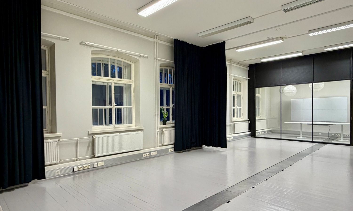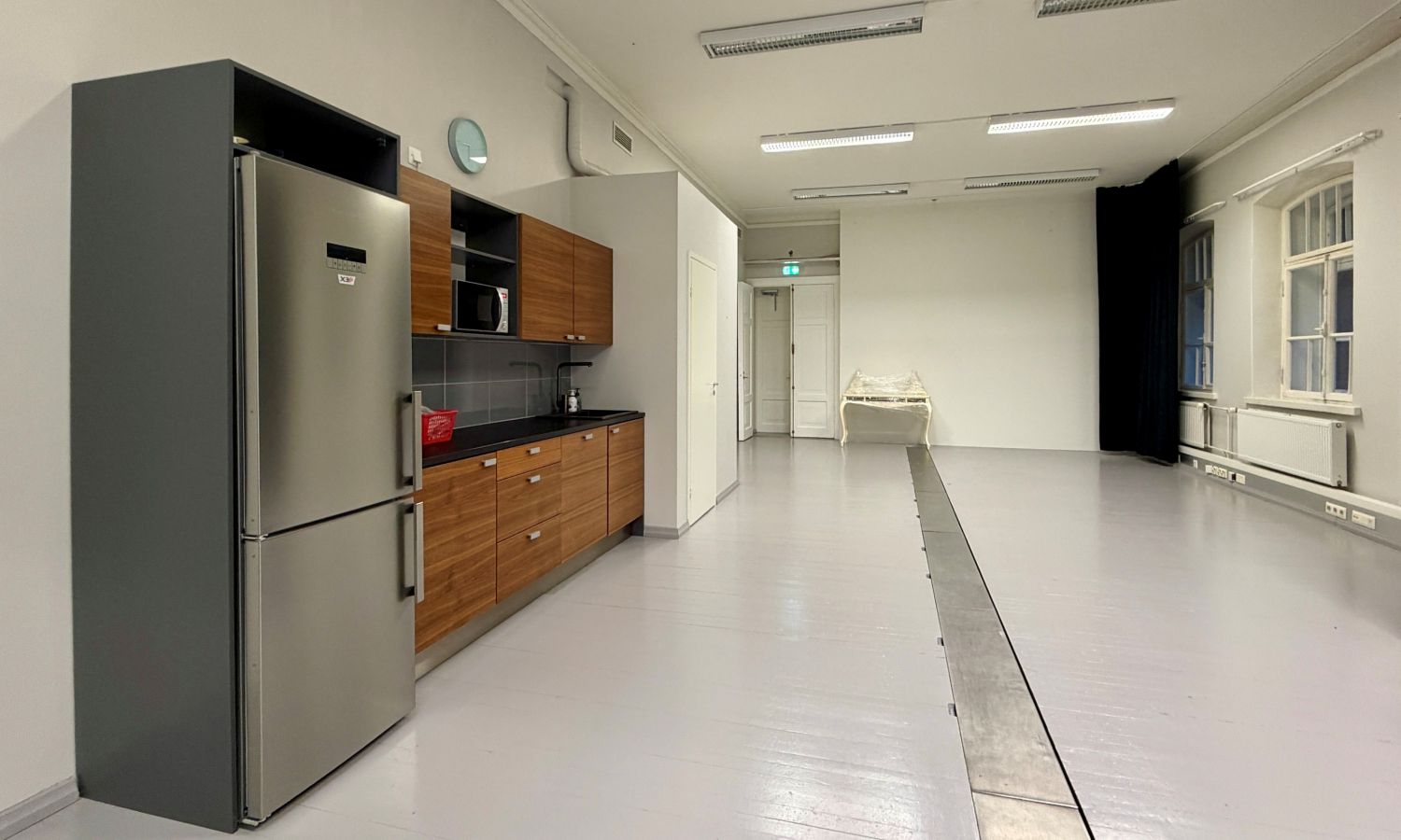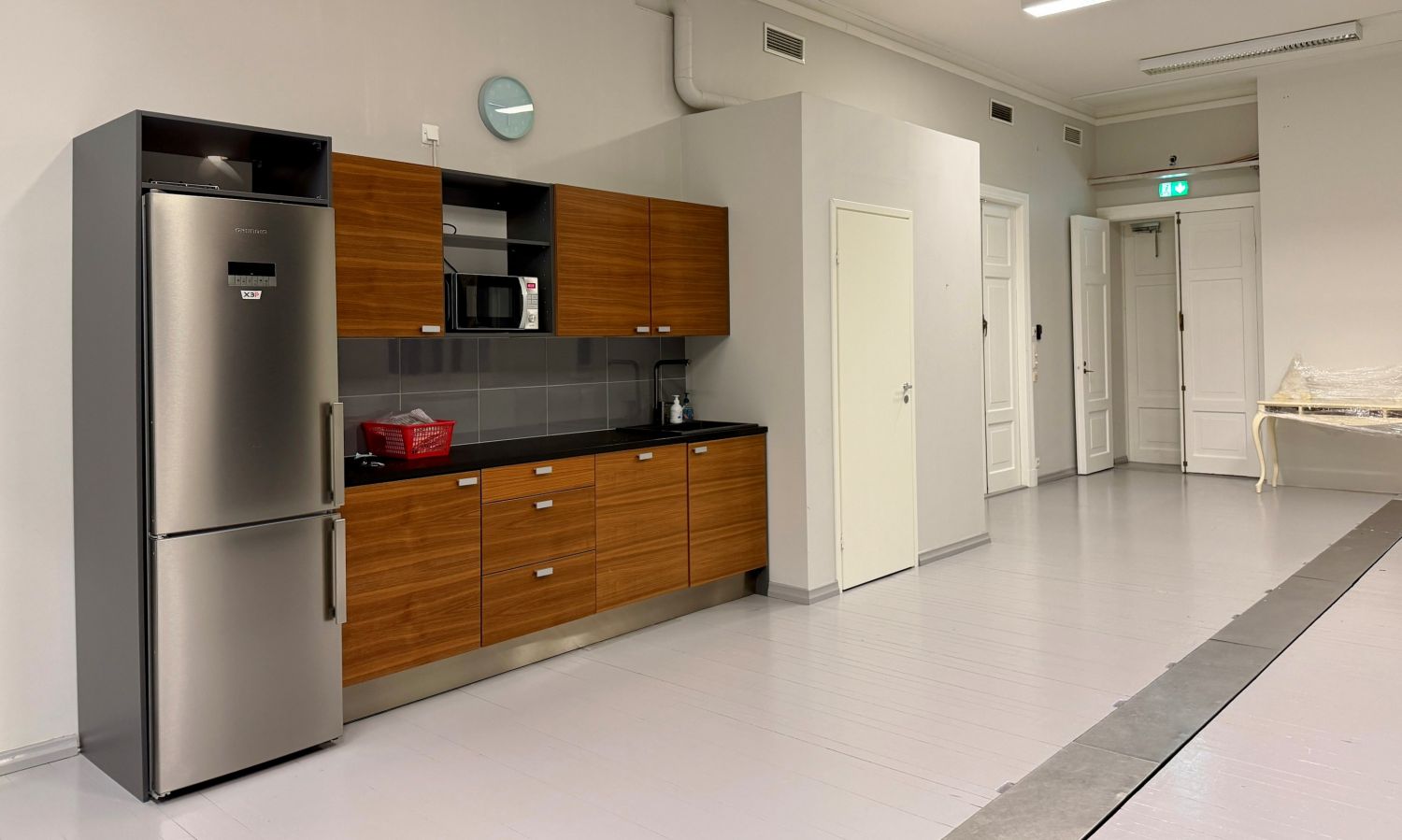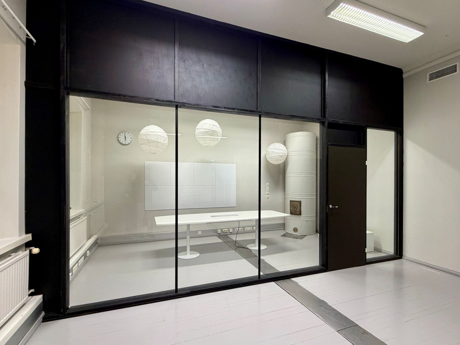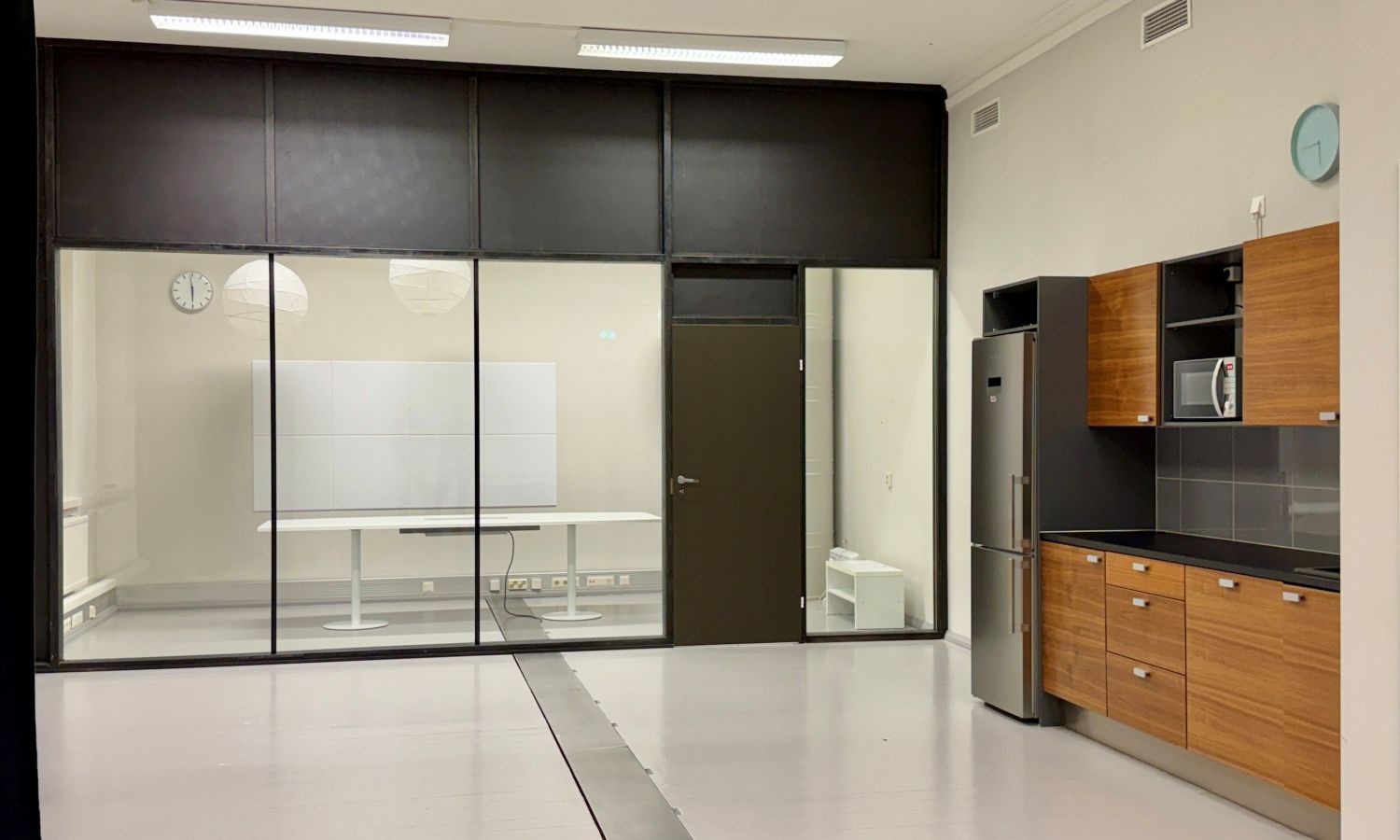 Tila on pääosin avonaista, mutta siinä on myös yksi lasiseinäinen neuvottelutila.