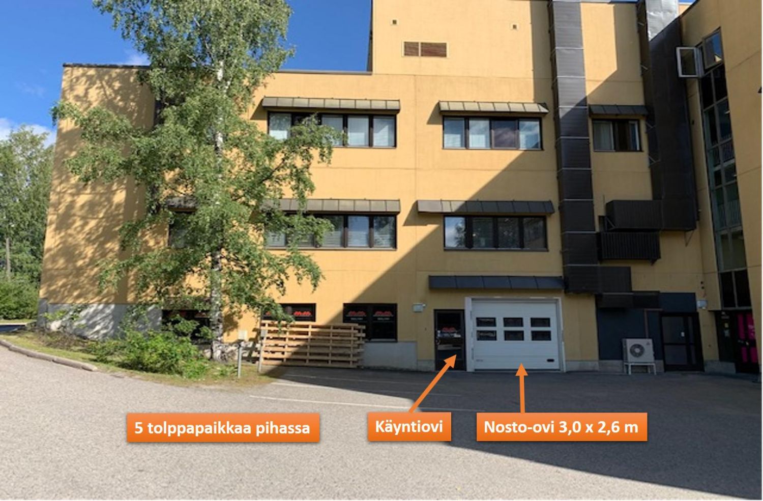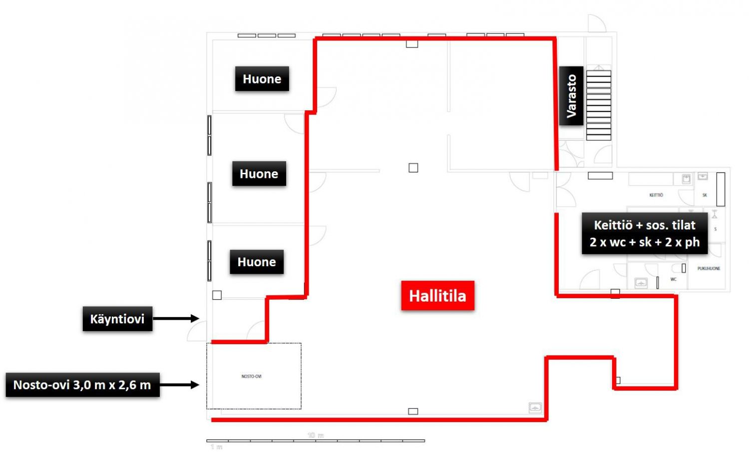 Nosto-ovi on 3,0 x 2,6 metriä ja erikseen on käyntiovi sisääntultaessa. VW Transporter sopii ovesta sisään.