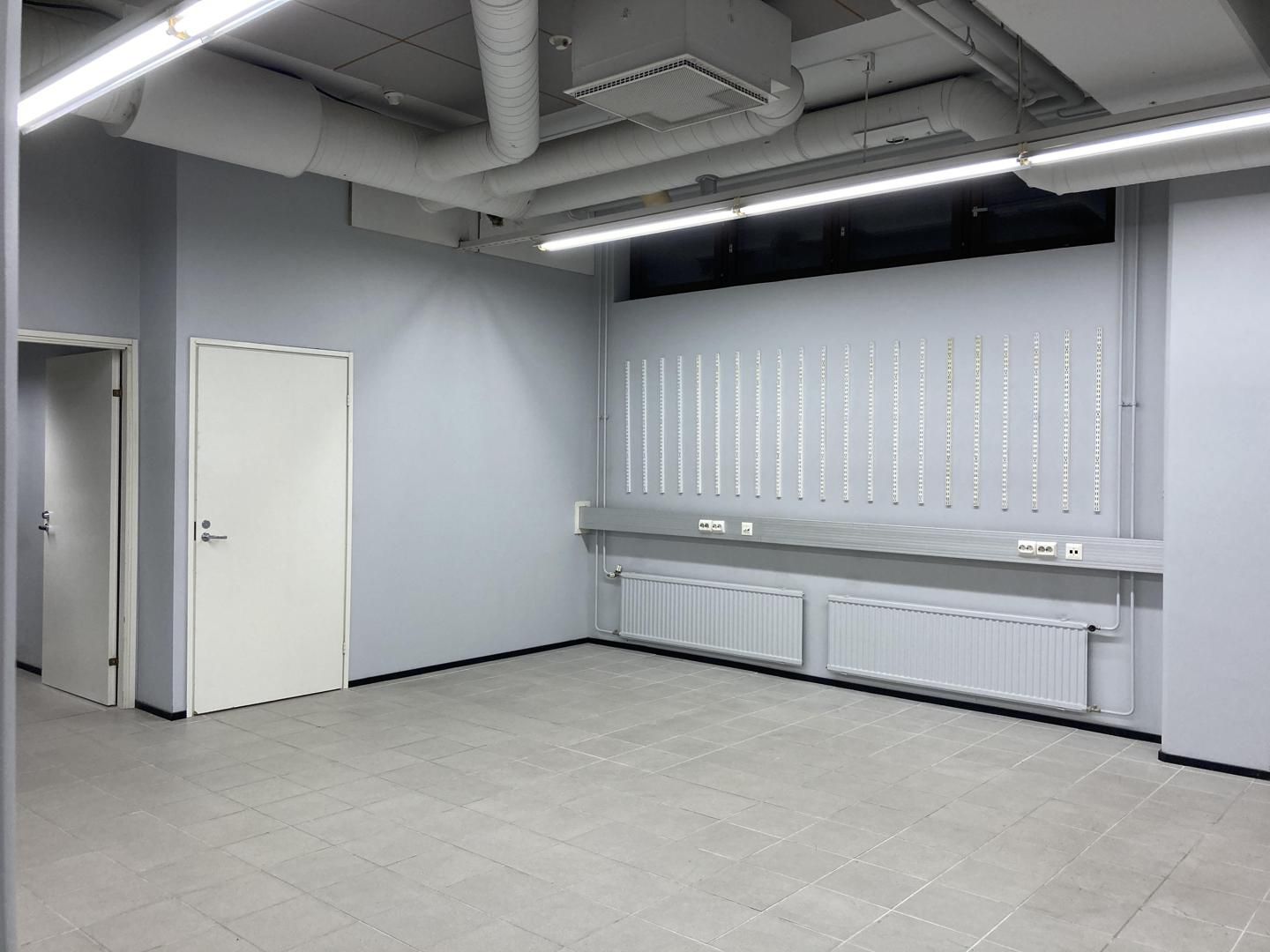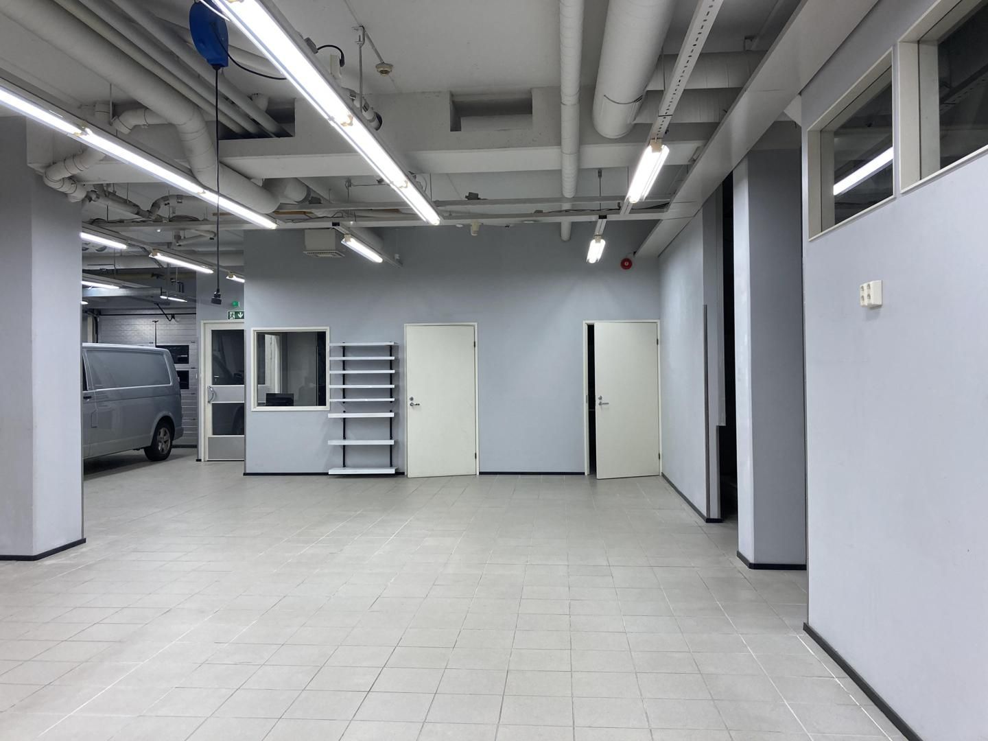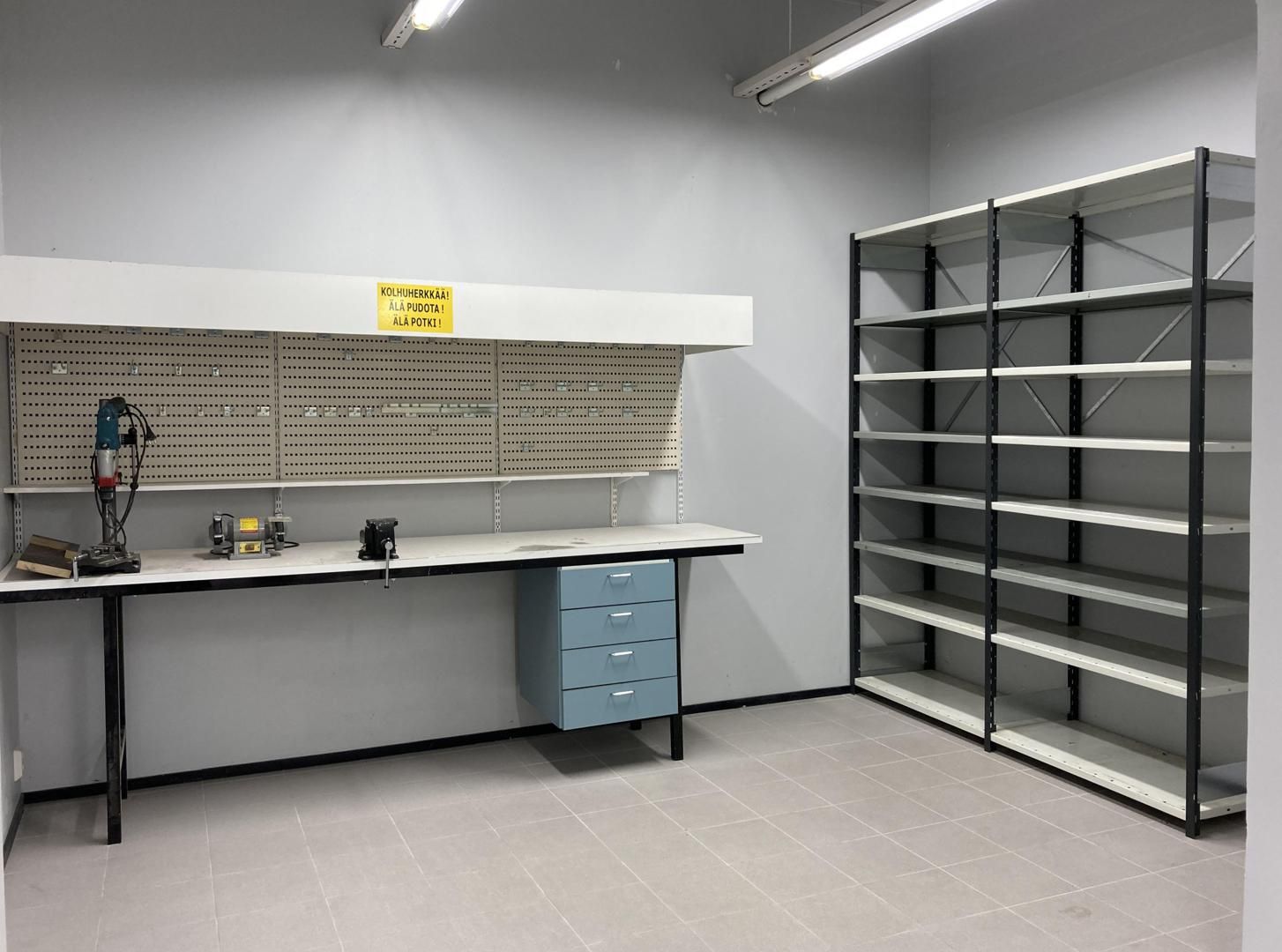 Laattalattiat, sisutusvalmiit seinät ja väliseinät, hyvä loisteputkivalaistus, koneellinen ilmanvaihto + teollisuustason ilmastointi kohdepoistoilla.
