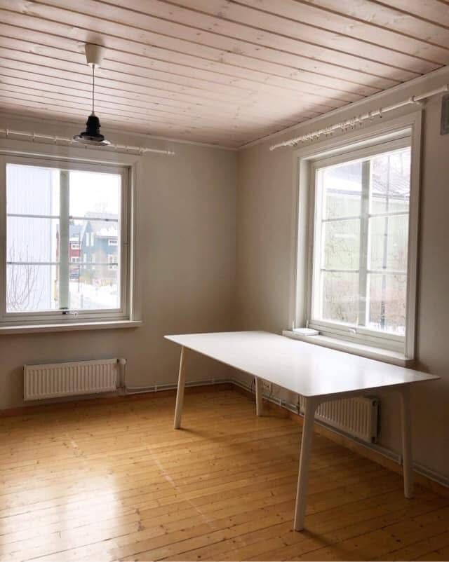 Tila on noin 35 neliötä, ilmava, valoisa ja arkipäivisin erittäin rauhallinen työskentelytila.