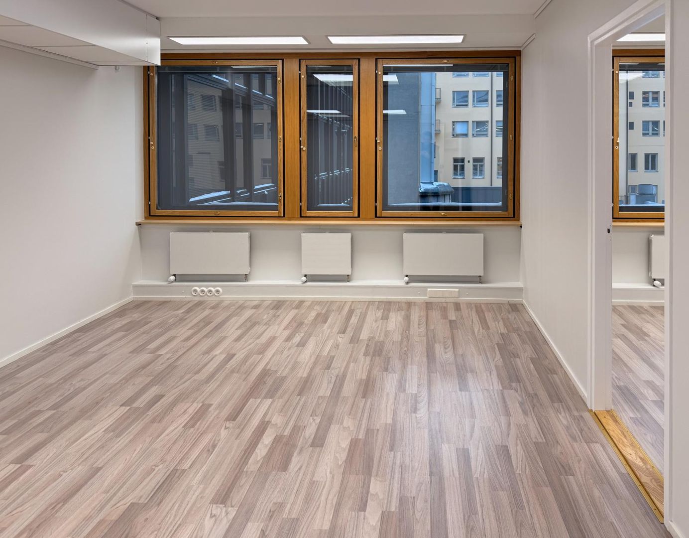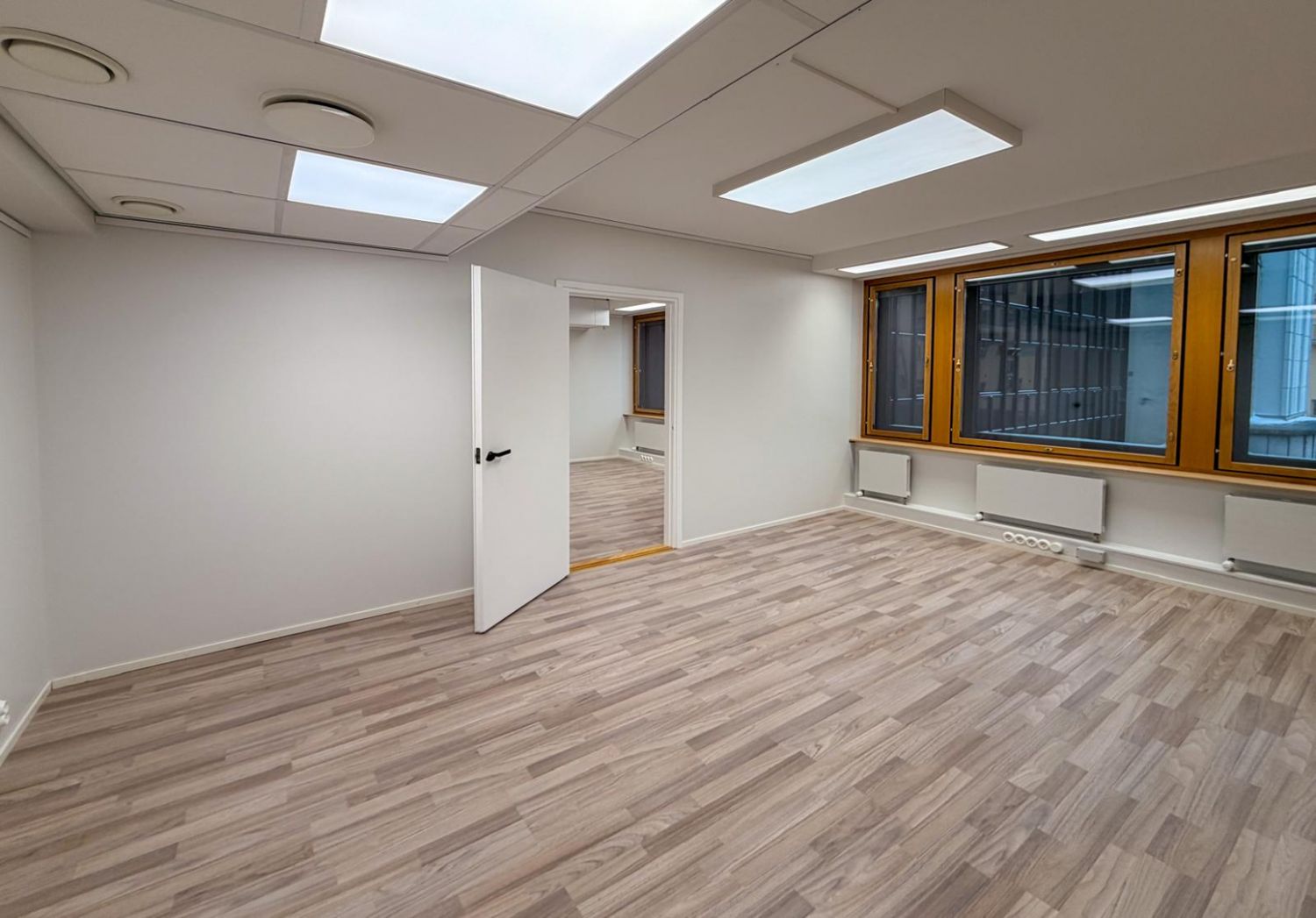 Uudet himmennettävät LED-valaisimet. Isot ikkunat rauhalliselle sisäpihalle tuovat runsaasti luonnonvaloa.