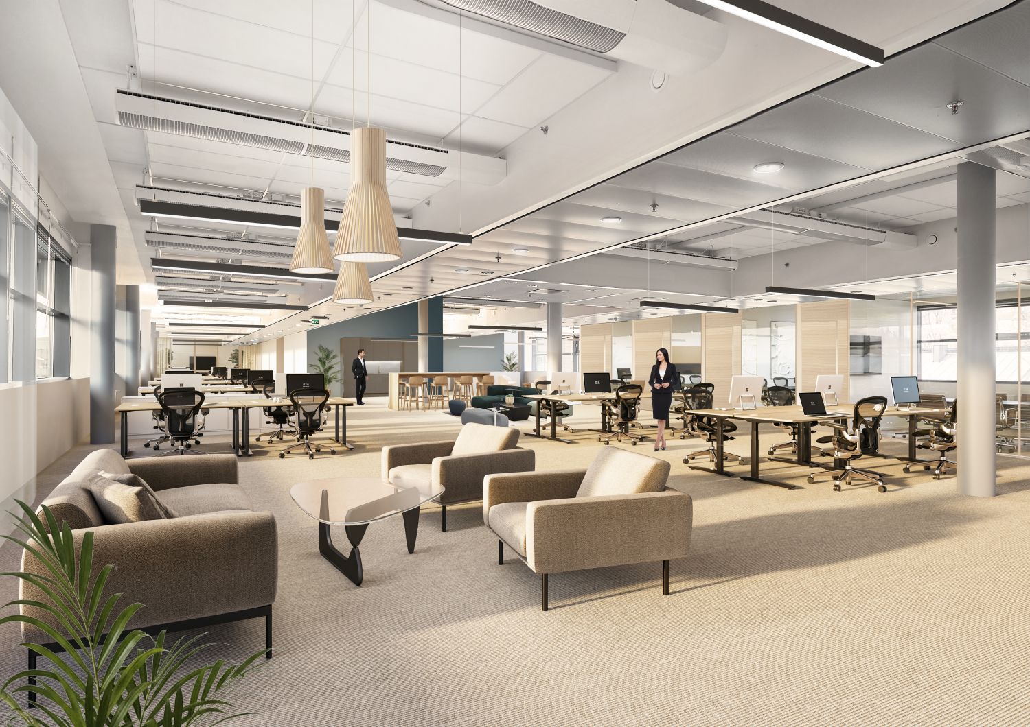 Valoisaa ja avaraa toimistotilaa keskeisellä paikalla. Tila on pääosin avotoimistoa, jonka mukavuutta lisää huoneilmanjäähdytys.