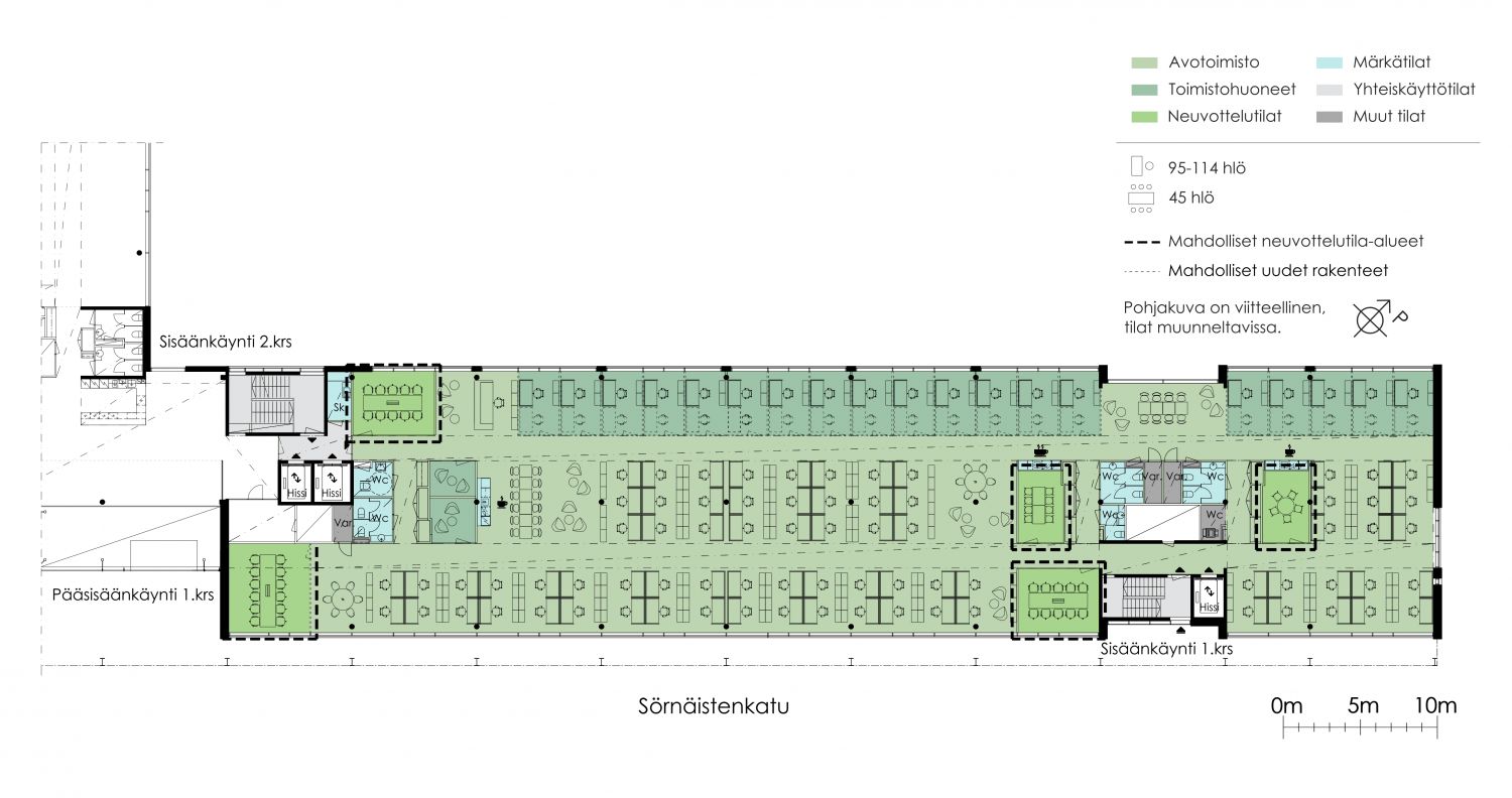 Toimitilavaihtoehtoja on tarjolla pienistä 41 m² toimistohuoneista aina 1800 m² yhden kerroksen kokonaisuuksiin. Isompia toimistokokonaisuuksia on mahdollista jakaa myös noin 270–570 m² palasiin. Toisen kerroksen yhteyteen on mahdollista rakentaa myös kevyttä tuotantotilaa lastauslaiturilla.