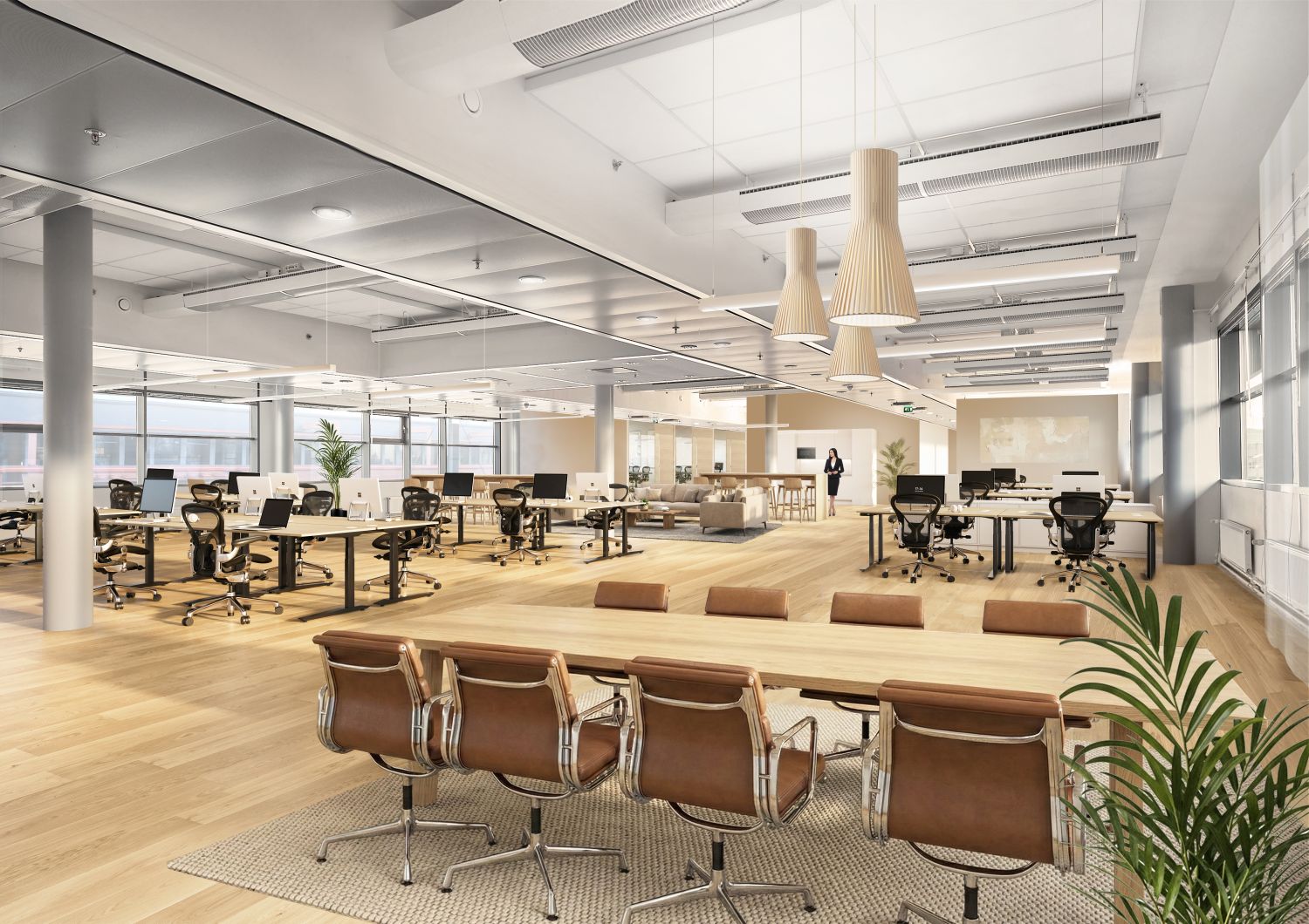 Valoisaa ja avaraa toimistotilaa keskeisellä paikalla. Tila on pääosin avotoimistoa, jonka mukavuutta lisää huoneilmanjäähdytys.