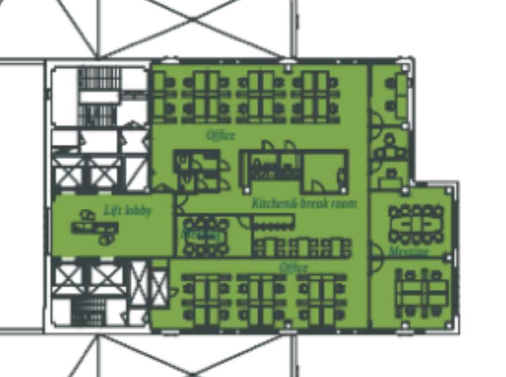 Tämä 417 m² toimistotila sijaitsee kiinteistön 9. kerroksessa. Toimistossa on avotilaa, huoneita, ja siihen kuuluvat omat keittiö- ja wc-tilat. Kuvat ovat yleiskuvia kiinteistön tiloista.