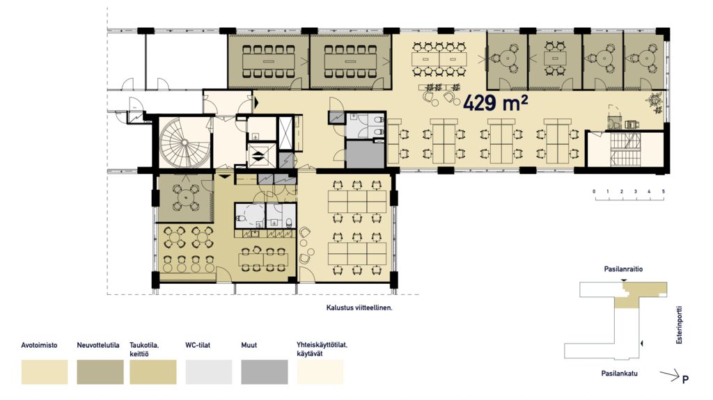 Tämä 429 m² toimisto sijaitsee kiinteistön 5. kerroksessa C-rapussa. Tila remontoidaan uudelle vuokralaiselle. Muutostyöt huomioiden tila on vuokrattavissa 1.8.2026 alkaen. Kuvat ovat yleiskuvia kiinteistön tiloista.