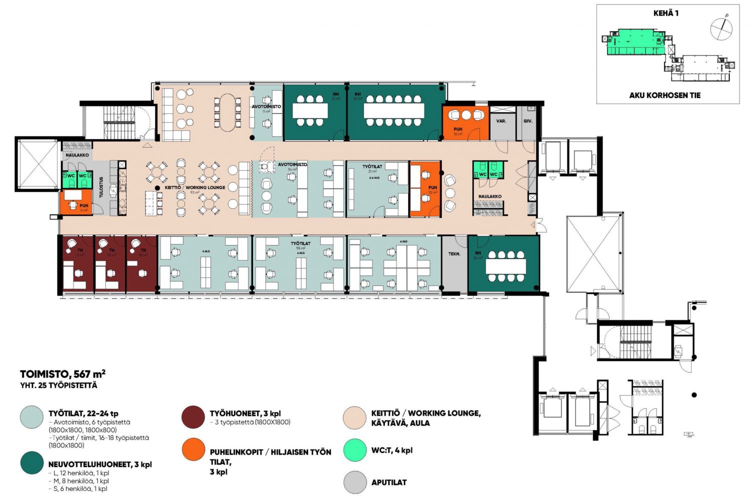 Suurempaan tilantarpeeseen soveltuva toimisto, jossa on mahdollista toteuttaa erilaisia tilaratkaisuja. Tilasovituksesta riippuen tilaan on mahdollista sijoittaa 30-50 työpistettä. Vetäytymis-, neuvottelu- ja avotilan määrää mahdollista muokata tarpeen mukaan.