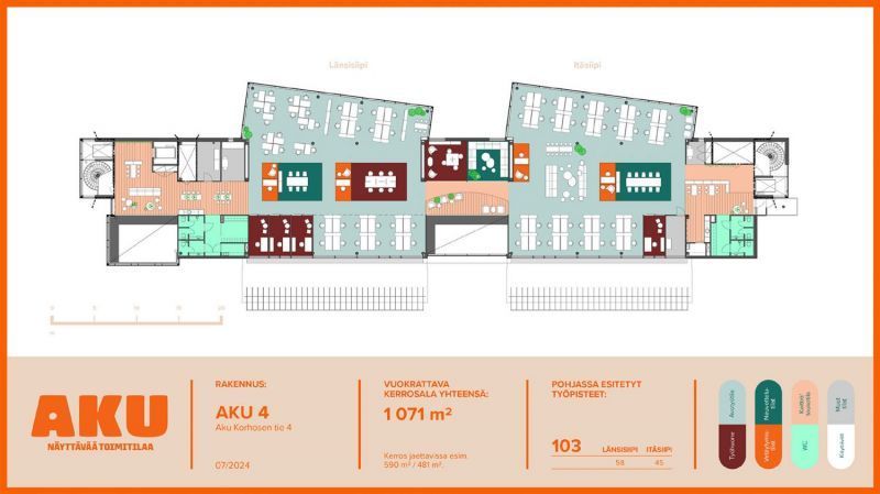 AKU on kolmen kiinteistön moderni ja laadukas kokonaisuus, joka tarjoaa muuntojoustavat toimitilat sujuvaan hybridityöhön. Valoisat ja avarat tilat mukautuvat yrityksen tarpeisiin ja tukevat viihtyisää, tehokasta arkea, jossa vuokralainen on keskiössä.