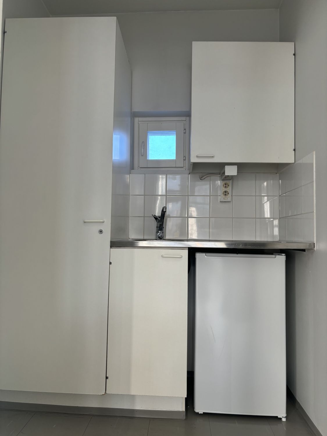 Pieni keittokomero, jossa kaapistot, allas ja jääkaappi