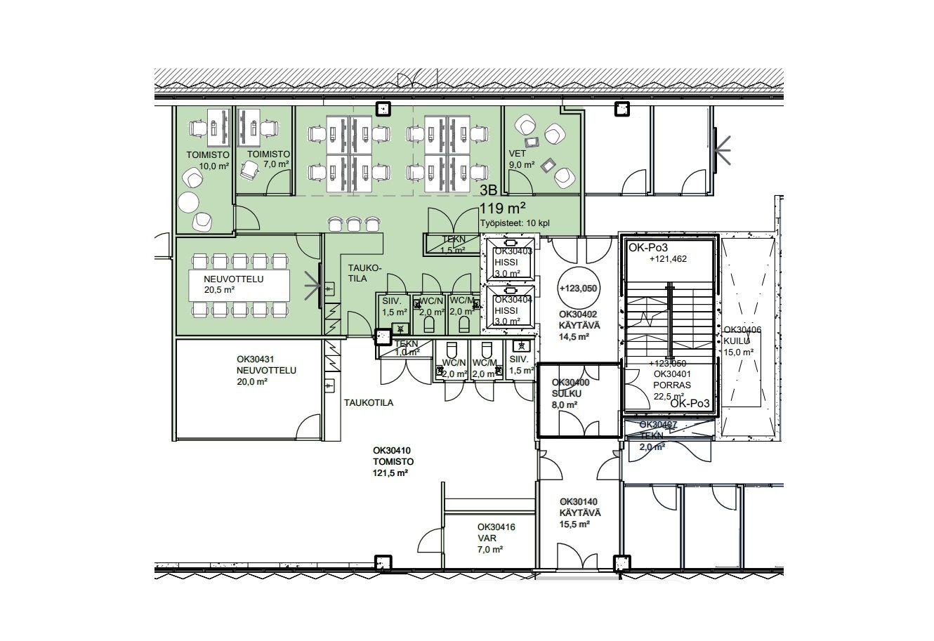 3. kerros, toimisto (119 m2), jyvitetty pinta-ala 136,6 m2