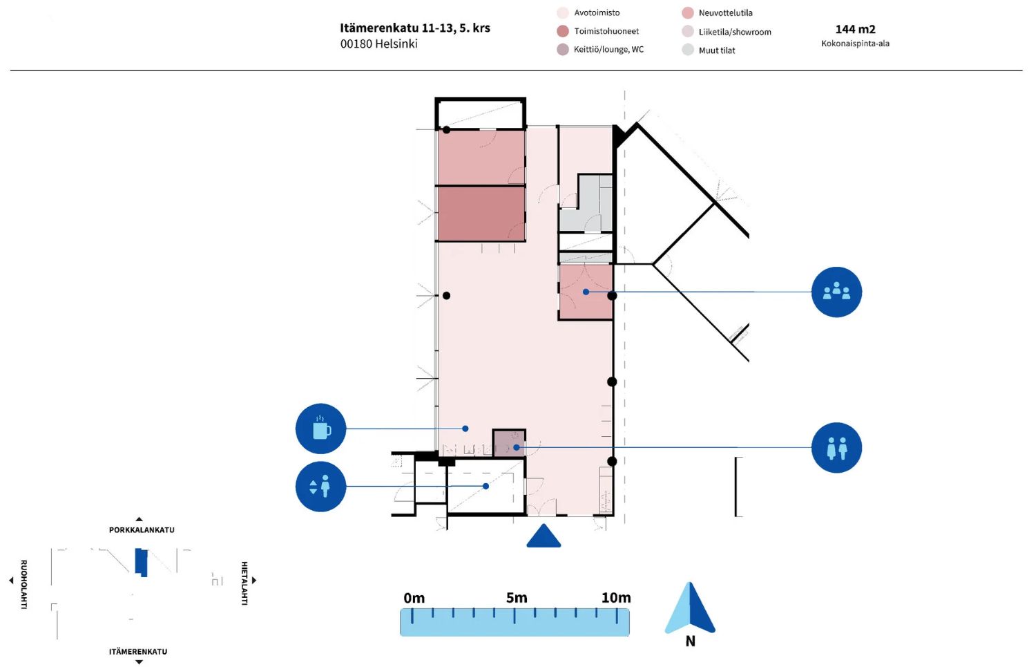 Siisti 5. kerroksen 144 m² toimistotila kiinteistössä jossa hyvät palvelut Ruoholahden metron välittömässä läheisyydessä.