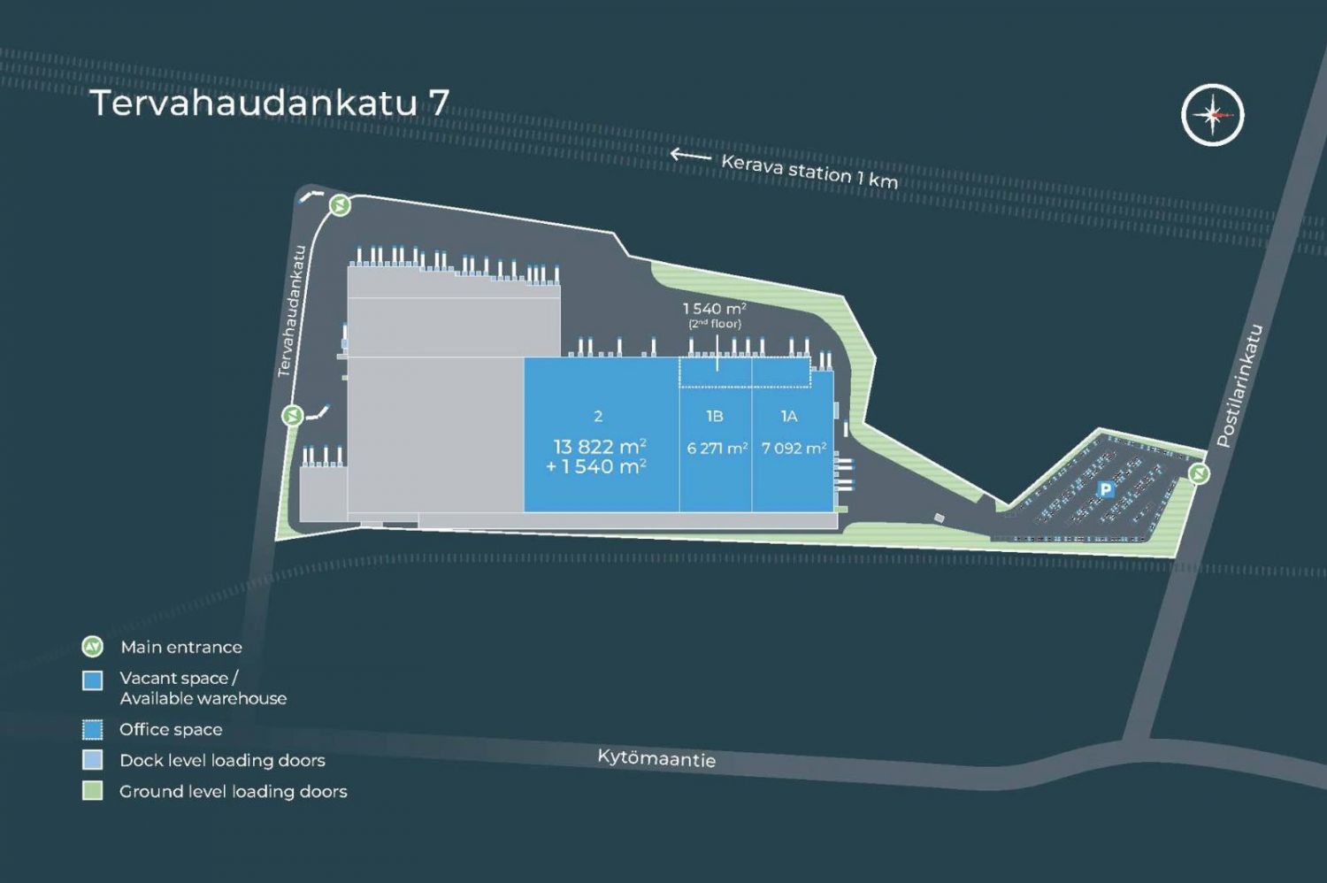Kiinteistön sijainti Keravalla on logistisesti erinomainen junaradan ja Lahden moottoritien (E75) välittömässä läheisyydessä. Yhteys niin Helsingin keskustaan (31 km), lentoasemalle (20 km) kuin Vuosaaren satamaankin (23 km) on sujuva. Kiinteistölle on oma junaraideyhteys. Kohteeseen on helppo saapua myös julkisilla liikennevälineillä, sillä Keravan juna-asemalle on alle kilometri.