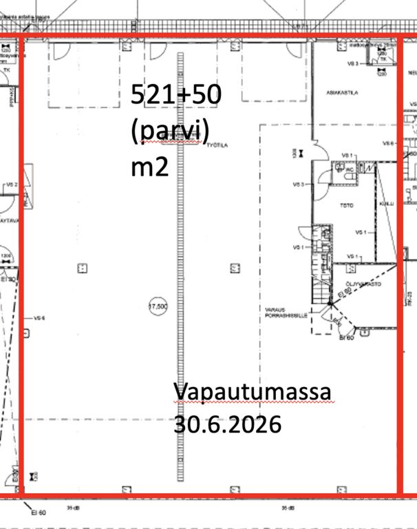Tämä 571m² liiketila sijaitsee kiinteistön 2. kerroksessa, kansitasanteella. Tila on autokorjaamon käytössä, ja se vapautuu 30.6.2026. Tilaan sisältyy 50 m² parvitila, jossa on toimistoa. Tilaan kuuluu siisti asiakkaiden vastaanottotila, noin 4,2 metriä korkea sisäänajettava avara tila sekä pesutila.