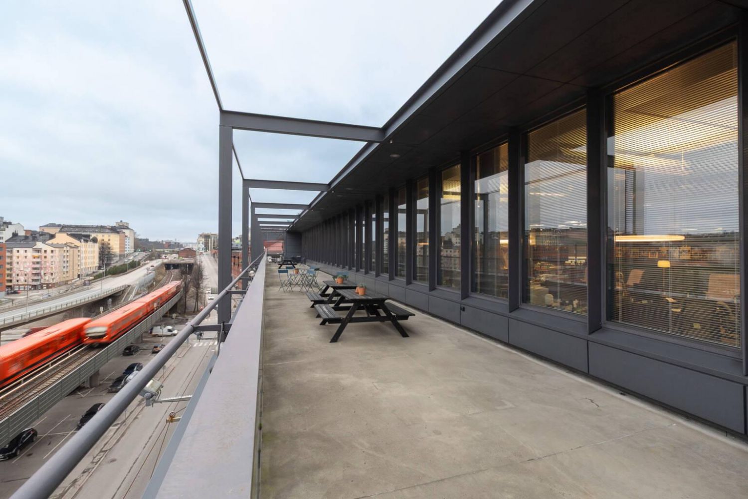 Kahteen ilmansuuntaan avautuvat terassit tuovat tilaan ainutlaatuisen lisän. Itään avautuva terassi suuntaa metrolle ja Rediin, kun taas etelänpuoleinen tarjoaa kaupunkinäkymät Suvilahden yli. Molemmat luovat upean ympäristön tauoille, kohtaamisille ja rennolle yhdessäololle, ja toisella terassilla sijaitseva katettu osa toimii kätevästi esimerkiksi kalusteen kausisäilytykseen.