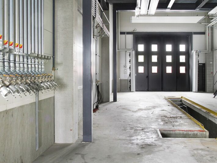 Nykyaikainen raskaankaluston huoltohalli. Vapaana n. 308 m2:n lohko, jossa on huoltokuilu ja varaus jarrudynamometrille sekä parvi n. 99 m2, yht. n. 407 m2.