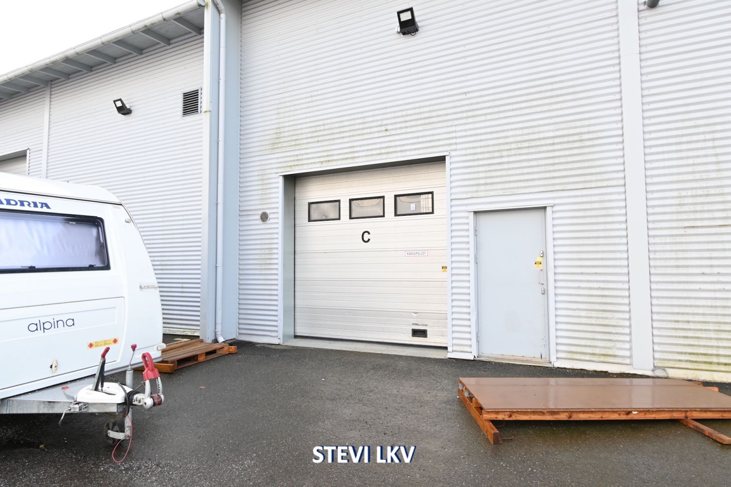 Tilaan nosto-ovi (2,95m x 2,6m) ja käyntiovi.