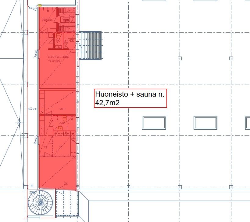 Katutason tila tarjoaa selkeän ja avaran myymälä- tai liiketilan hyvällä näkyvyydellä. Yläkerran huoneisto tuo käyttöön erillisiä työ- ja oleskelutiloja, neuvottelukäyttöön sopivia huoneita sekä saunatilat, jotka soveltuvat henkilöstön käyttöön tai asiakastilaisuuksiin.