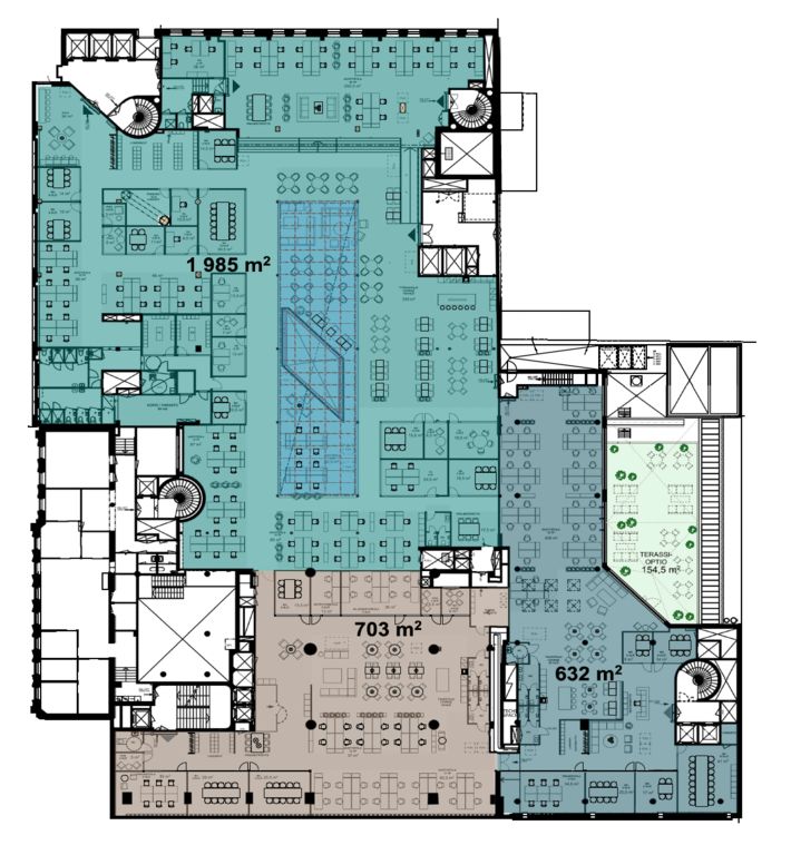 Tämä 3320 m² toimistotila sijaitsee kiinteistön 3. kerroksessa. Tila on tällä hetkellä raakapinnoilla, mutta se remontoidaan tulevan vuokralaisen tarpeiden mukaan korkeatasoiseksi toimistotilaksi. Sekä pohjaratkaisuun että materiaaleihin on nyt mahdollista päästä vaikuttamaan. Tila on avara ja valoisa, isojen ikkunoiden lisäksi tilan keskellä on myös kattoikkunoita, jotka tuovat tilaan lisää luonnonvaloa. Tilaan on tavarahissiyhteys. Toimiston yhteyteen on mahdollista rakentaa jopa 180 m² kokoinen terassi. Toimisto on mahdollista jakaa kahdelle tai kolmelle käyttäjälle esimerkiksi 1985 m², 703 ja 632 m² tai 2475 m² ja 915 m² kokoisiin osiin.