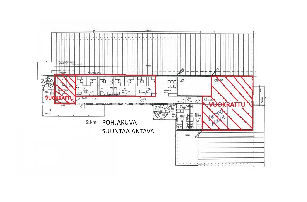 Vuokrattavaa tilaa on vapaiden toimistojen osalta yhteensä n. 45 m2, minkä lisäksi käytössä on yhteiset tilat, joita toisessa kerroksessa on n. 68 m2. Jyvitettävät tilat on jo huomioituna vuokrassa.