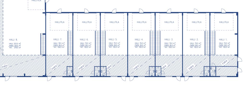 Vuokrattava tila on kooltaan 106 m². Pohjakuvassa halli nro 6. Tila koostuu 79 m² hallitilasta, 27 m² toimistoparvesta, omasta suihkusta sekä wc-tilasta. Nosto-ovi on kooltaan 4x4m. Tiloissa on myös hiekan- ja öljynerotuskaivot, koneellinen ilmanvaihto, laajakaistayhteydet mahdollistava puhelinkaapelointi sekä voimavirtapistoke + valovirtapistokkeet. Ei autokorjaamoksi. Kuvat ovat vastaavankokoisesta hallitilasta.