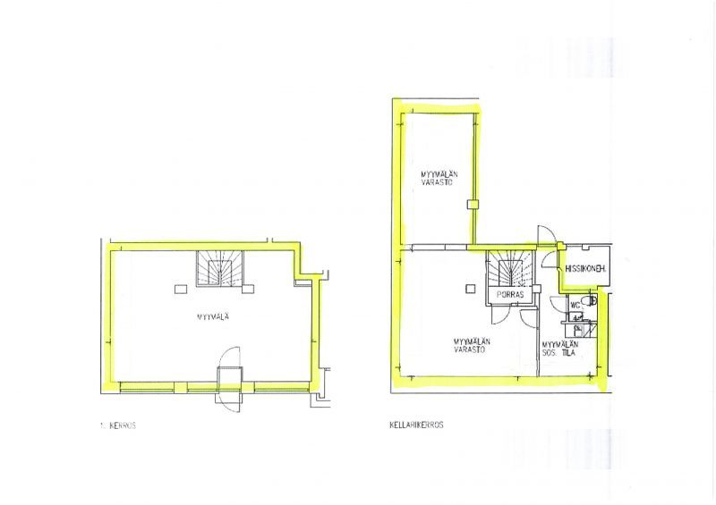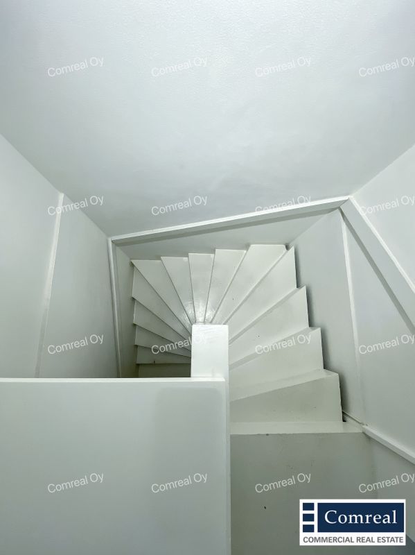 Tila jakaantuu katutason liiketilaan 53 m² ja alakerran varasto/työtilaan 61 m².