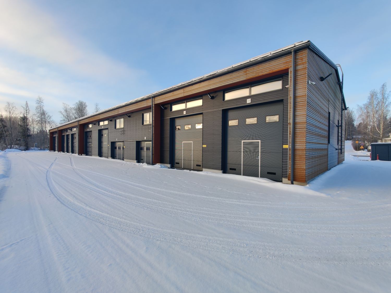 Moottoroitu nosto-ovi erillisellä käyntiovella. Autolla sisään ajettava tila. Tilamitat: 8,17 (Pituus) 5,32 (Leveys) 5,00 (Korkeus). Ovimitat: 3,40 (Leveys) 3,90 (Korkeus).