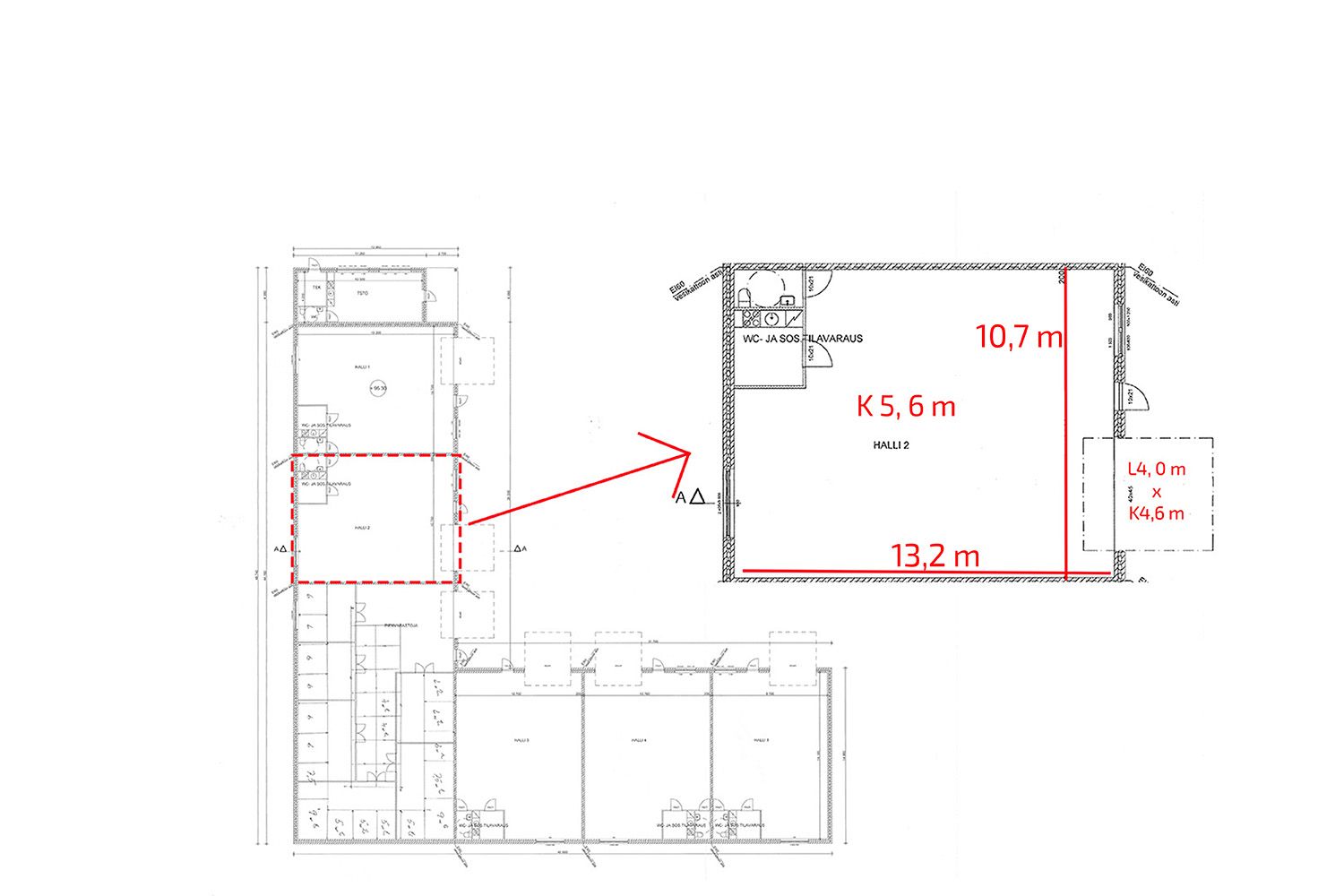 Halli on rakennuksessa tila B ja tilan pinta-ala on 141 m², syvyys on noin 13,2 metriä ja leveys 10,7 metriä. Tilan varusteluun kuuluu sähkökäyttöinen nosto-ovi (L4,0 m x K4,6 m) erillisellä käyntiovella, hiekan- ja öljyn erottava lattiakaivo sekä keittiö- ja taukotila sekä wc. Vapaa sisäkorkeus on noin 5,6 metriä. Hallissa on tällä hetkellä parvirakennelma, joka puretaan sen vapautuessa seuraavalle vuokralaiselle.