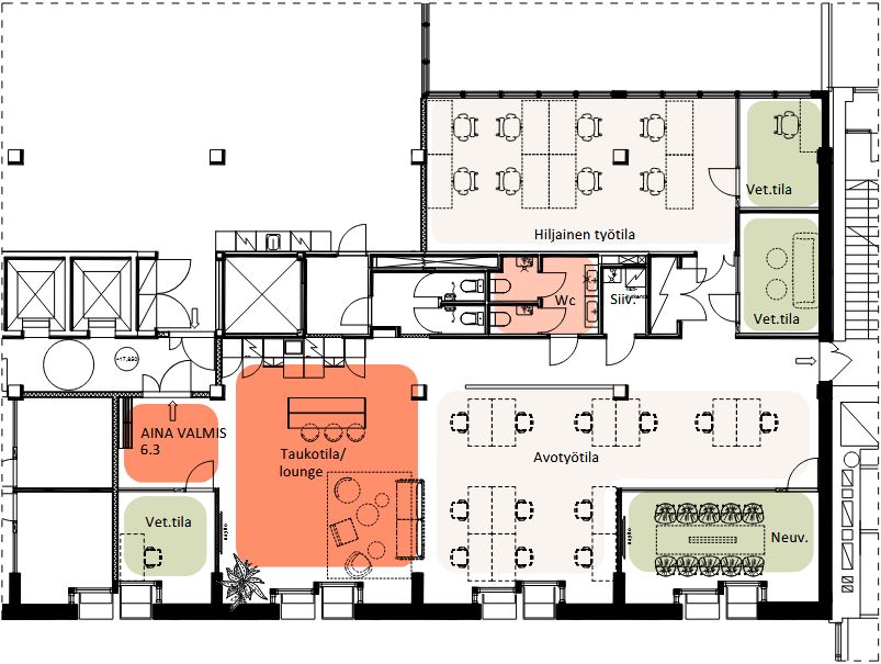 Vuokrataan 6.kerroksen toimitila. Tila remontoidaan Aina Valmis -konseptin mukaisesti laadukkailla ja vastuullisilla materiaaleilla sekä toimivalla tilaratkaisulla vastaamaan nykytyöelämän vaatimuksia. Ohessa havainnollistavia kuvia kiinteistön tiloista.
