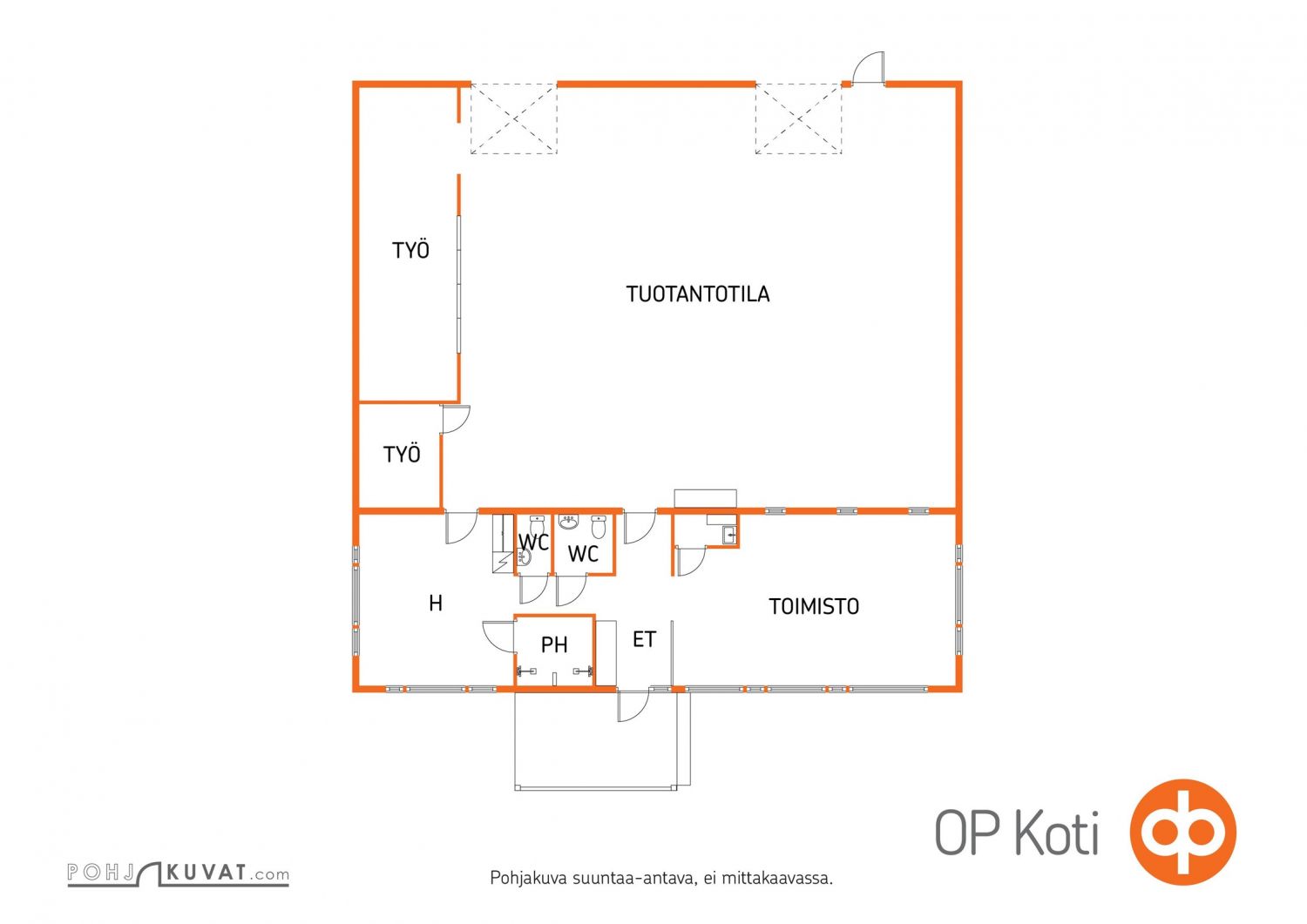 Tuotantotila 178 m2, työtila 26 m2, työtila 7 m2, sos.tilat 35 m2, suihku 7 m2, WC 1,7 m2, WC inva 2,9 m2, eteis- ja konttoritilat 51 m2, siivouskomero 1,6 m2. Kiinteistö/laitostunnus: 905-42-8-3-L2.