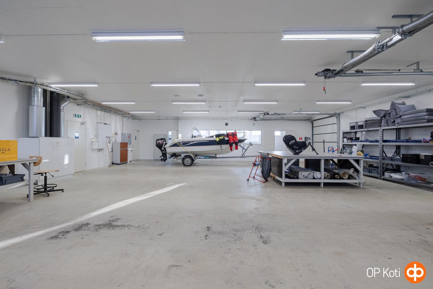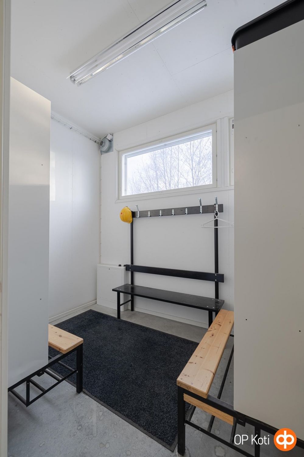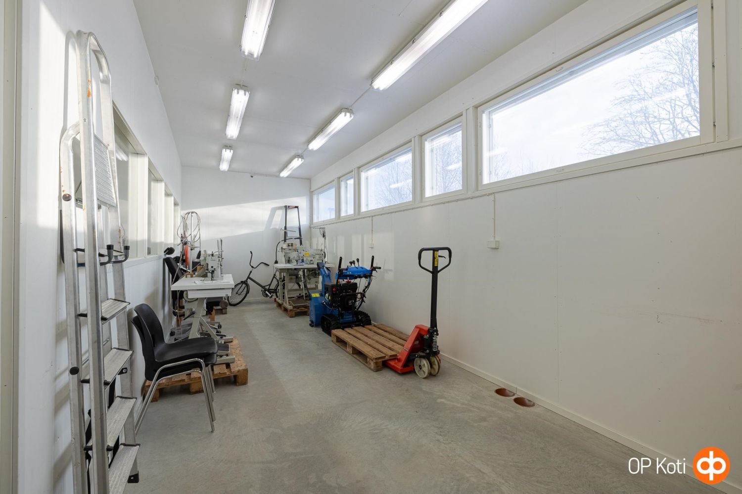 Tämä yksitasoinen tila on suunniteltu tehokkaaseen käyttöön: tilavat tuotanto- ja työtilat, erillinen konttori, sosiaalitilat, kaksi wc:tä (joista toinen inva-wc), suihku sekä hyvin varusteltu keittiö tekevät arjesta helppoa. Varustukseen kuuluu jääkaappi, liesi, mikroaaltouuni, pesukone ja kuivausrumpu - kaikki mitä tarvitset henkilöstön viihtyvyyteen. Lisäksi käytössäsi on useita työpöytiä, reilusti säilytystilaa ja kalusteita. Nostovet (2,5 m leveä, 2,3 m korkea) ja tuotantotilan 3 metrin huonekorkeus mahdollistavat monipuolisen käytön.