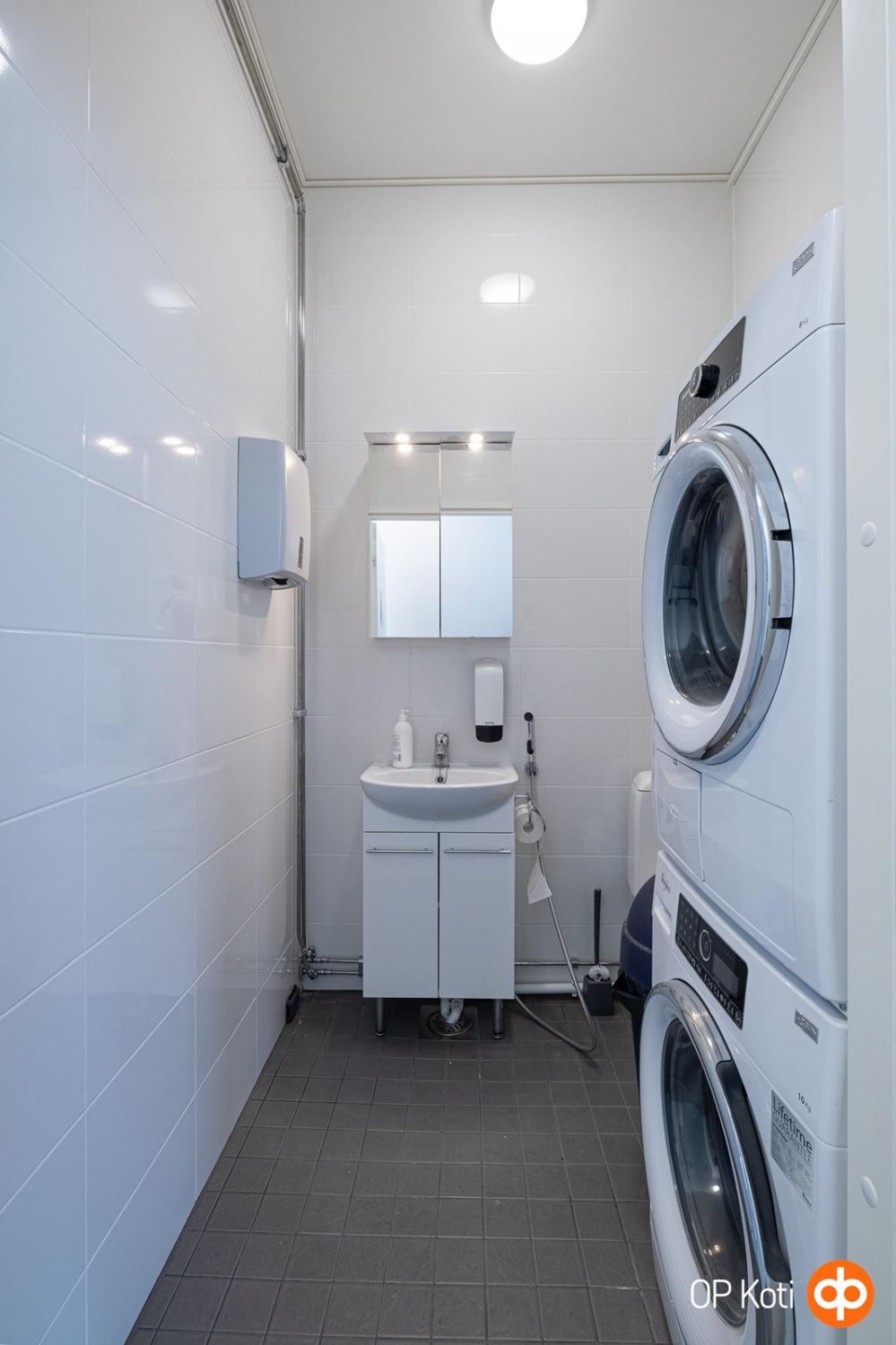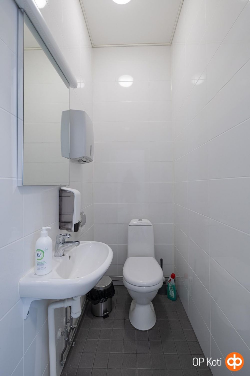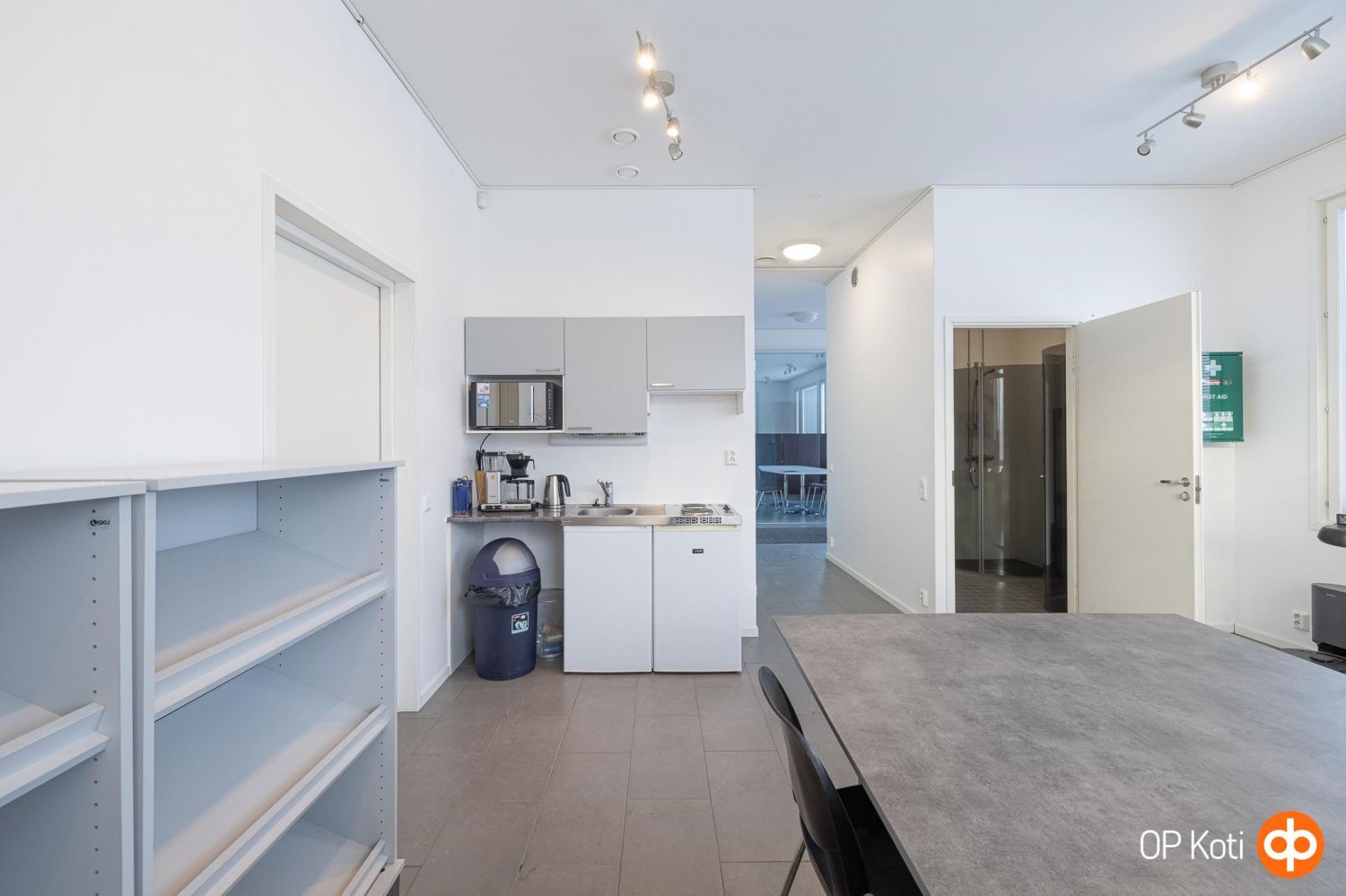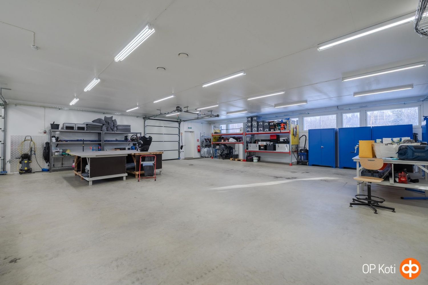 Tämä yksitasoinen tila on suunniteltu tehokkaaseen käyttöön: tilavat tuotanto- ja työtilat, erillinen konttori, sosiaalitilat, kaksi wc:tä (joista toinen inva-wc), suihku sekä hyvin varusteltu keittiö tekevät arjesta helppoa. Varustukseen kuuluu jääkaappi, liesi, mikroaaltouuni, pesukone ja kuivausrumpu - kaikki mitä tarvitset henkilöstön viihtyvyyteen. Lisäksi käytössäsi on useita työpöytiä, reilusti säilytystilaa ja kalusteita. Nostovet (2,5 m leveä, 2,3 m korkea) ja tuotantotilan 3 metrin huonekorkeus mahdollistavat monipuolisen käytön.