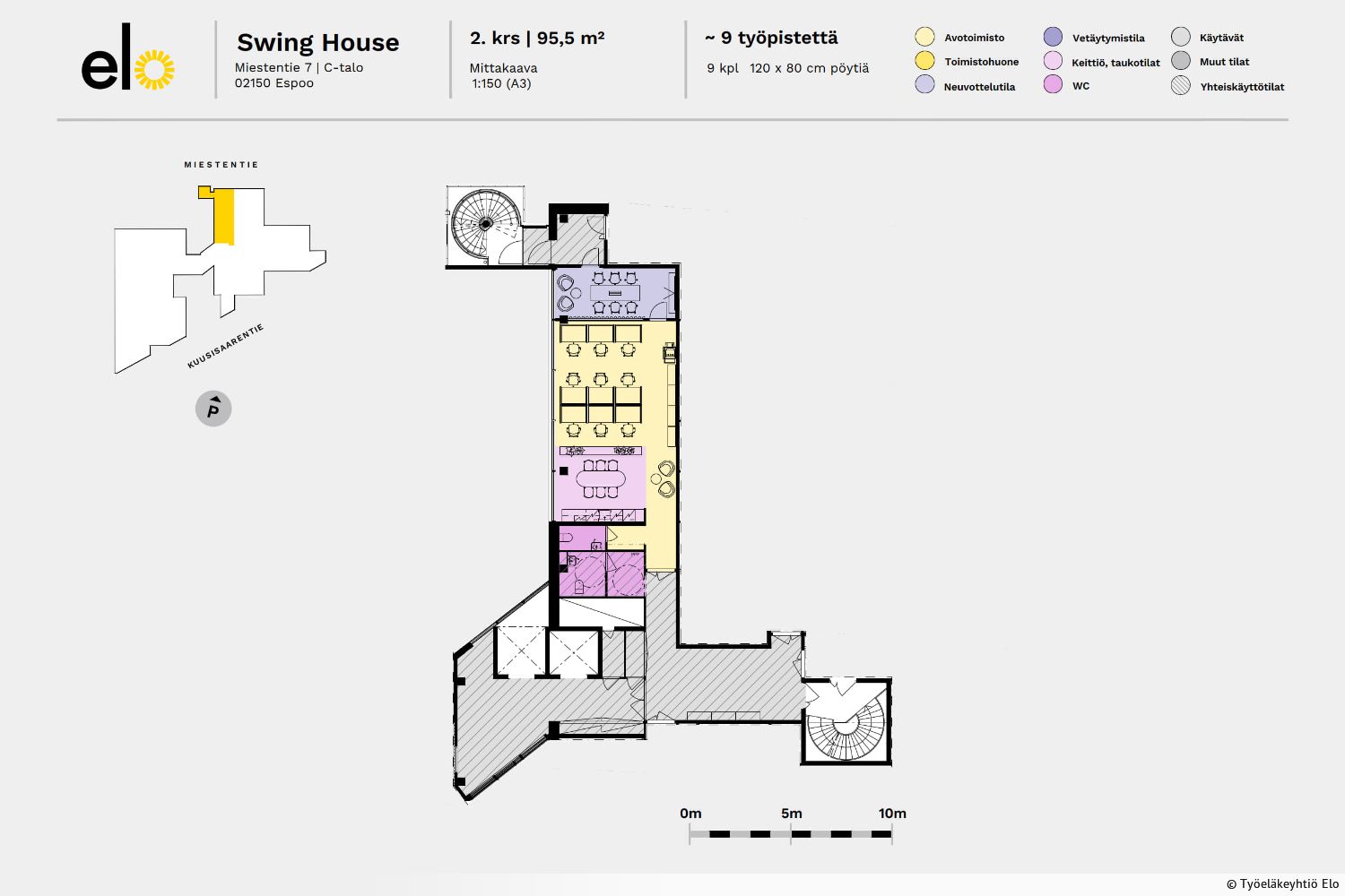 Swing House -kampus on kahden toimistorakennuksen ja hotellin muodostama kokonaisuus. Kohteesta löytyy erikokoisia toimistotiloja pinta-alaltaan aina noin 95 neliömetristä 1 800 neliömetriin. Jaettavien kerrosten aulatilojen pinta-alat jyvitetään toimistotiloihin.