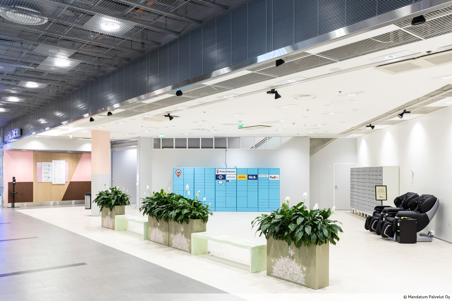 Kauppakeskuksessa on tilavat pysäköintitalot, joissa myös sähköautojen latauspaikkoja.