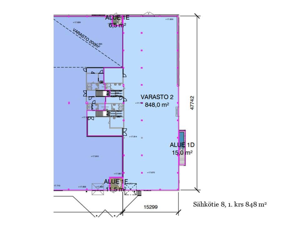 Tilakokonaisuus, joka koostuu kolmen nosto-oven 848 m² varastosta ja toisessa kerroksessa sijaitsevasta 348 m² toimistosta. Varastosta on porrasyhteys suoraan toimistotiloihin.