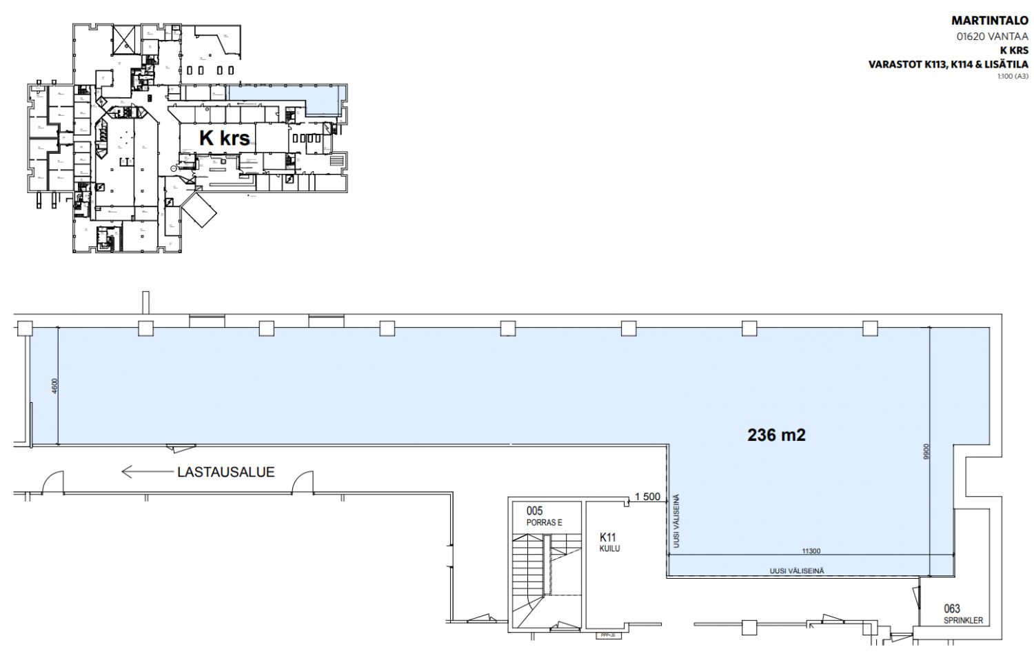 Vantaankoskella Martintalossa on tarjolla 236 m²:n kellarikerroksen varastotila, joka soveltuu erinomaisesti yrityksen varastointi- ja logistiikkatarpeisiin. Selkeä ja pitkänomainen tila mahdollistaa tehokkaan hyllytyksen ja tavaran käsittelyn, ja noin 3,5 metrin huonekorkeus tuo joustavuutta erilaisiin varastointiratkaisuihin. Pohjaratkaisun perusteella tila on yhtenäistä avointa varastoaluetta, jonka yhteydessä on lastausalue helpottamassa tavaraliikennettä. Kulku tilaan tapahtuu porrasyhteyden kautta, ja kokonaisuus on suunniteltu sujuvaan ja käytännölliseen käyttöön.