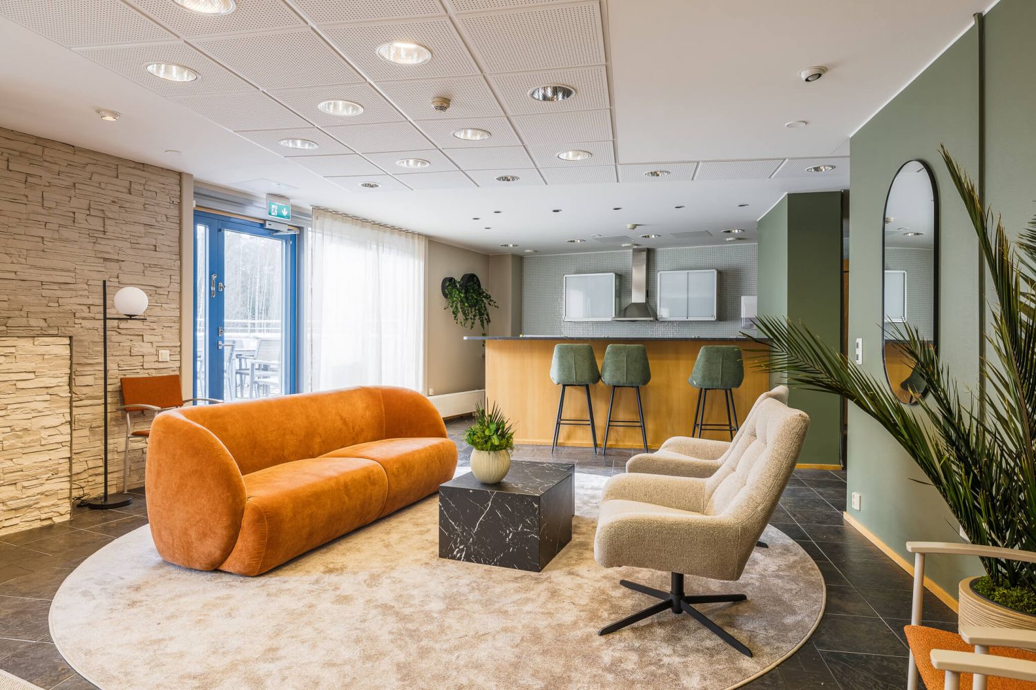 Kiinteistössä toimii suosittu henkilöstöruokala, ja isolla terassilla varustettu upea saunaosasto on vuokrattavissa vuokralaisten tilaisuuksiin. Kauppakeskus Jumbo ja sen monipuoliset palvelut sijaitsevat noin 5 minuutin ajomatkan päässä, ja lentokenttä on vain noin 4 km:n päässä.