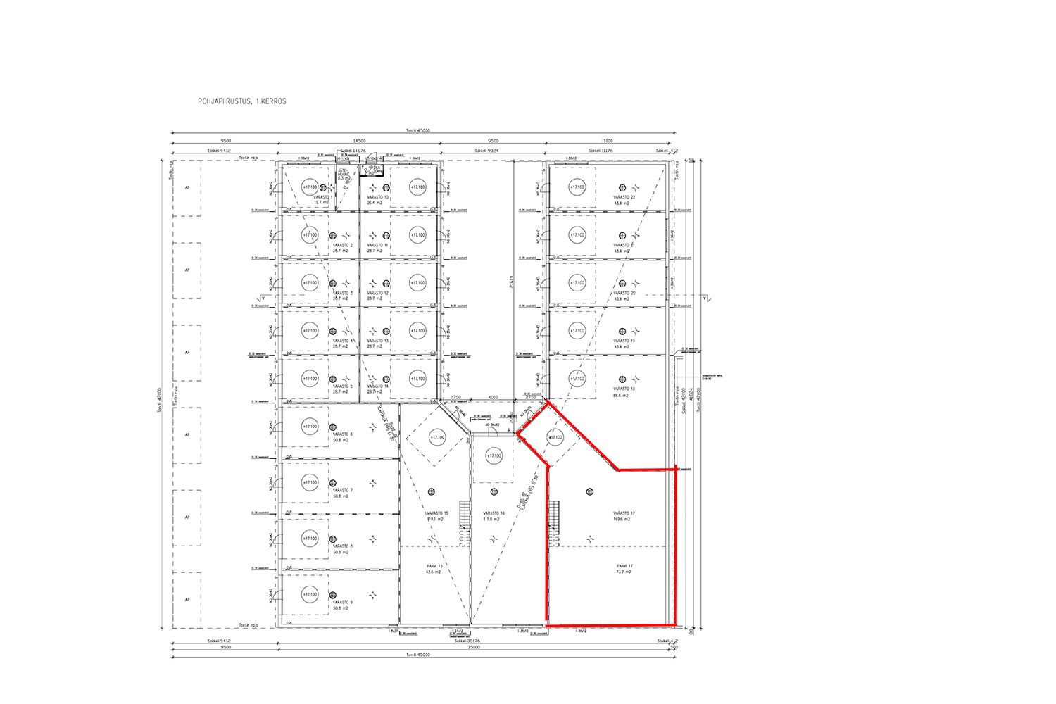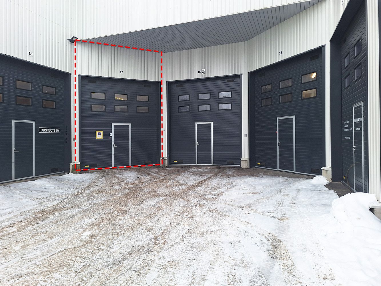 Keskeisellä sijainnilla Helsingin Konalassa on 169,6 m² hyvin varusteltu parvellinen hallitila vuokrattavana. Pohjakuvaan vuokrattava tila merkittynä (tila numero 17).