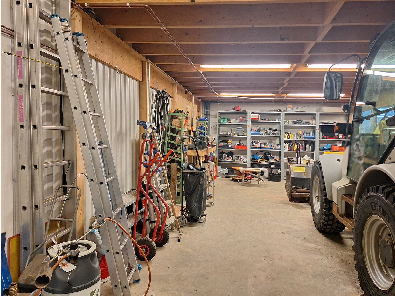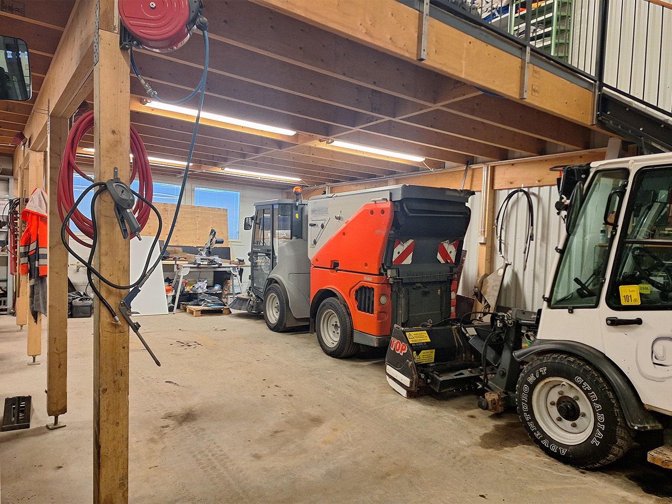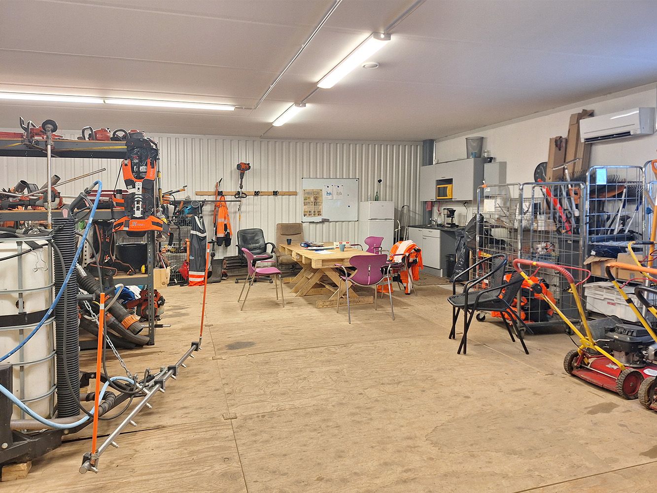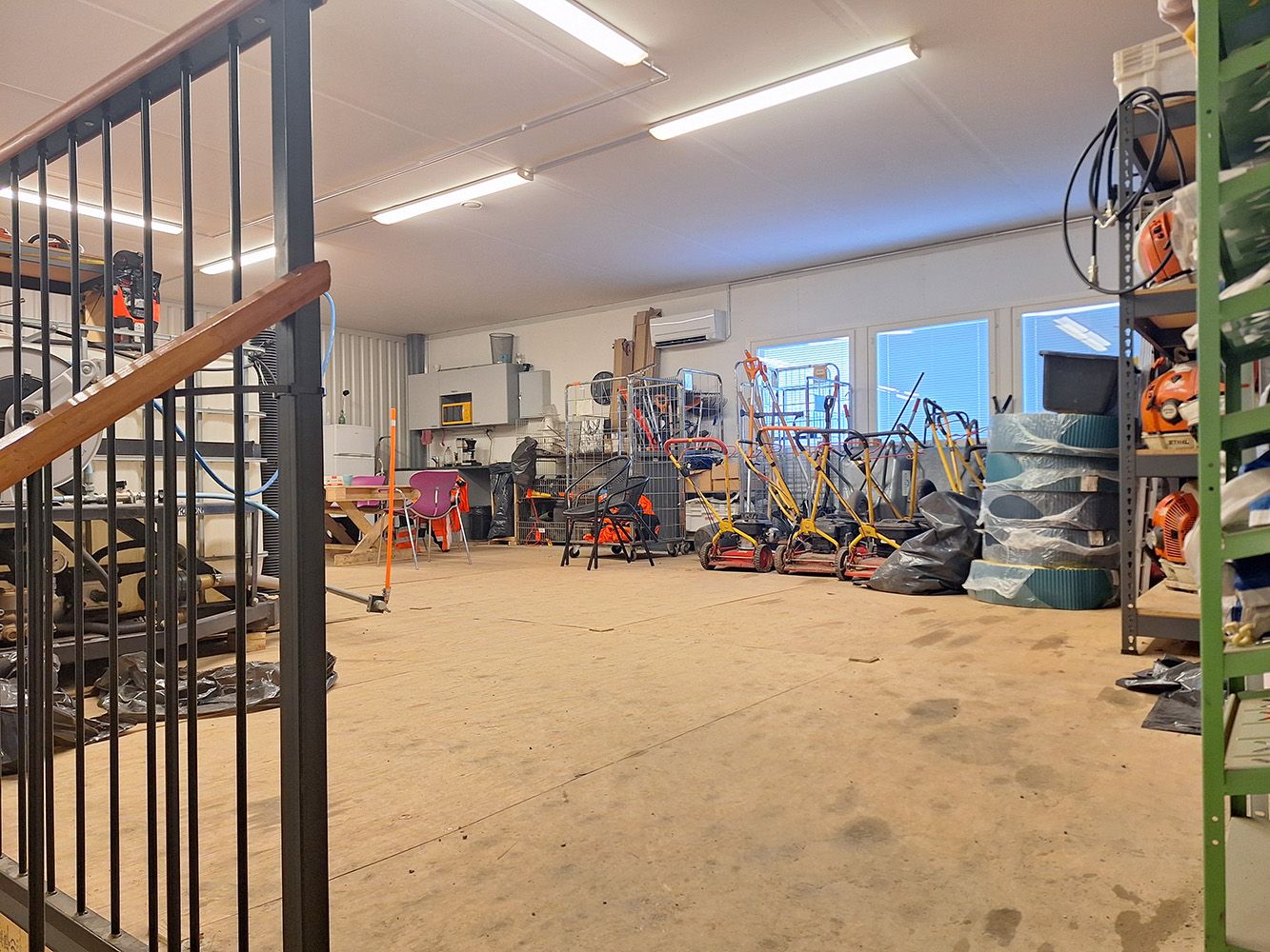 Parvi soveltuu lisäsäilytykseen, toimistoksi tai taukotilaksi. Parvella on minikeittiö ja vesipiste. Parven lisäksi hallitilan varusteluun kuuluu korkea käyntiovellinen nosto-ovi (L 3,5 m x K 4,0 m), voimavirta, ilmalämpöpumppu, lattiakaivo ja vesipiste ja wc.