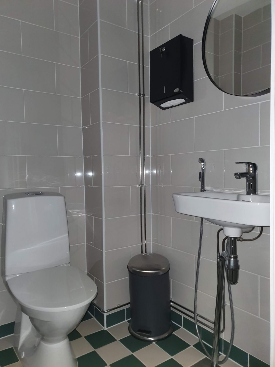 Hyvän kokoinen design-keittiö, mihin mahtuu ruokailupöytä ja kaksi WC-tilaa.