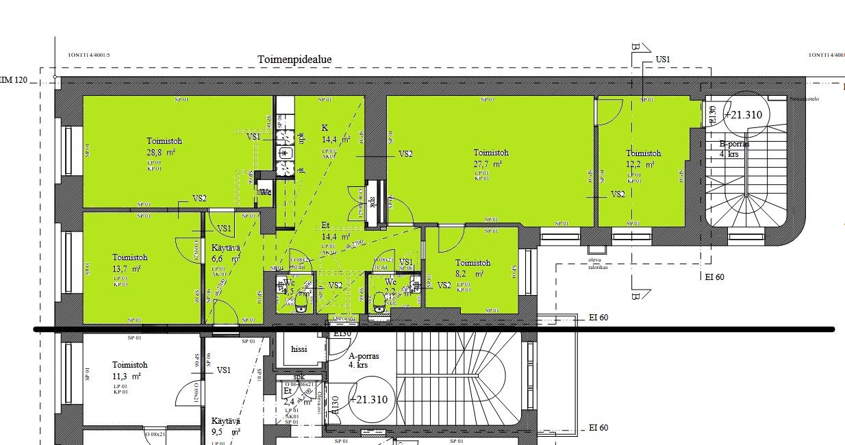 Tämä juuri remontoitu toimistotila sijaitsee rakennuksen 4. kerroksessa.