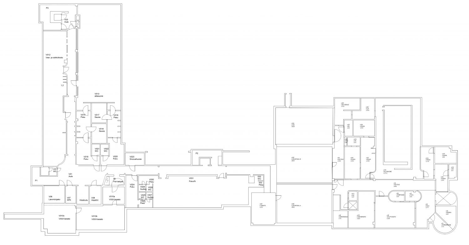 - kellari, 633,5m2, liikuntasali 128,9m2 ja pukuhuoneet, hoitohuoneita, uima-allasosasto kahdella saunaosastolla