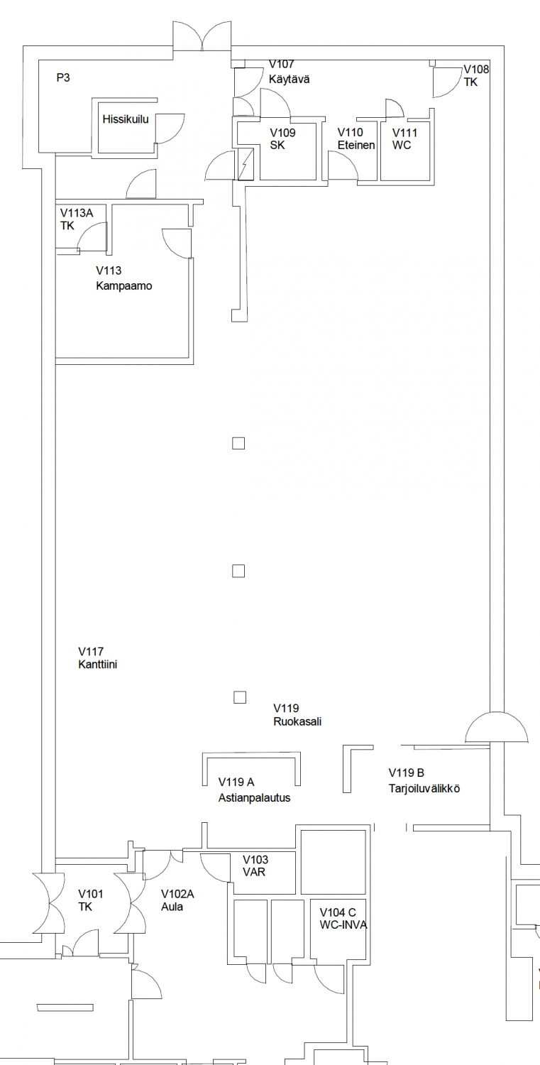 - 1. kerros 400m2, n. 350m2 avoin ruokasalina toiminut tila, vessa sekä n. 25m2 liiketila / toimisto, aulassa yhteisvessat