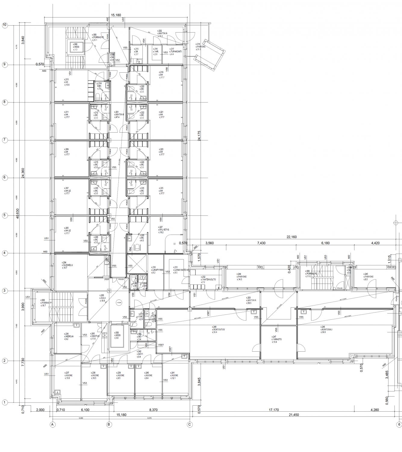 - 4. kerros, 420m2, 16kpl 2hlö 17,9-22,2 m2 majoitushuoneita omalla pesuhuoneella